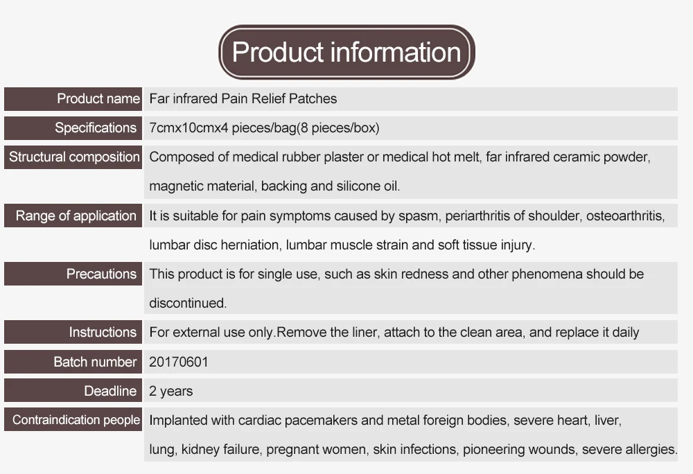 Описание продукта:Название продукта: дальние инфракрасные обезболивающие пластыриРазмер: 7*10 см (4 шт./пакет; 2 пак./кор.)