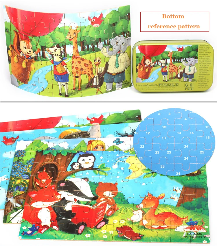 60 шт 3D DIY деревянные пазлы обучающая игрушка милая головоломка железная коробкаМультипликационные персонажи животные E Раннее Обучение для детей