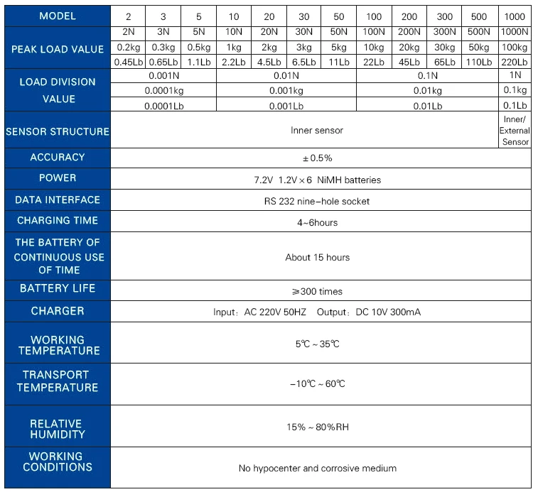 Датчик силы имеет преимущества высокой точности, простоты в эксплуатации и переноске. Более того, он имеет виды режимов тестирования, удобство для conner, и он может хранить и вводить данные в компьютер для анализа статистики, а также составляет тестеры с различными функциями, комбинирование с тестовыми грядками и зажимом. Пользователи могут вводить локальное ускорение гравитационного значения, чтобы сделать тест более точным