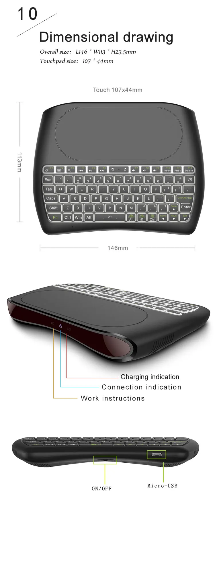 -3 в 1 Мультимедийный пульт дистанционного управления-самая мини беспроводная клавиатура с многофункциональным: тачпад + мышь + клавиатура +.RF 2,4G беспроводное соединение. -7 светодиодных подсветок-вы можете выбрать один из 7 различных светодиодных подсветок. Вы можете не только использовать эту клавиатуру ночью с другим закрытым освещением, чтобы не мешать другим, но и наслаждаться хорошим настроением и прекрасным опытом, который он приносит -Идеально подходит для таких устройств, как ПК, Pad,Mac, проектор, PS3,PS4,Google/Android TV Box, HTPC/ IPTV и т. Д. -Удобный -- не нужен драйвер, подключи и работай. Перезаряжаемый и съемный литий-ионный аккумулятор находится в задней части клавиатуры. Имеет режим автоматического сна и пробуждения. И вы можете разбудить устройство, нажав любую клавишу -Беспроводная мини-клавиатура с 78 клавишами. QWERTY клавиатура, которая поддерживает несколько пальцевых функций, одно нажатие пальца как функция левой мыши, два пальца как функция правой мыши. Технические данные -78 клавиш, беспроводная клавиатура 2,4 ГГц с тачпадом. -Мини-клавиатура QWERTY с мультимедийными клавишами управления и клавишами управления ПК для игр. -Подходит для hd-плеера, телеприставки, Android TV box, нетбука, ПК и проектора. -Максимальное рабочее расстояние: ≥ 10 м без отклонения сигнала и без ограничения направления. -С адаптером интерфейса USB. -Подходит для людей, чтобы смотреть телевизионные сети через широкополосный доступ, ПК и IPTV. -Сравнимый с реальным сенсором ноутбука. -Клавиши из ТПУ очень удобны для набора текста. -Мультимедийные элементы управления Microsoft для Windows. -Цвет: черный -Язык: английский или русский -Время зарядки: 2 дома -Емкость аккумулятора: 300 мА · ч Система поддержки: -Windows 2000.XP. Vista.Windows CE.Windows 7 Android Что в коробке? -1 х английская или Русская клавиатура (литий-ионный аккумулятор) -1 беспроводной usb-приемник -1 х USB кабель для зарядки -1 х Руководство пользователя Фотографии
