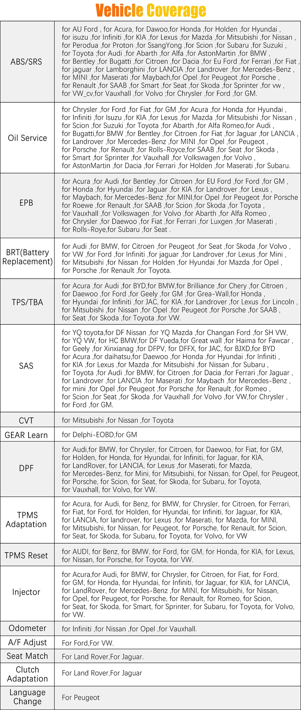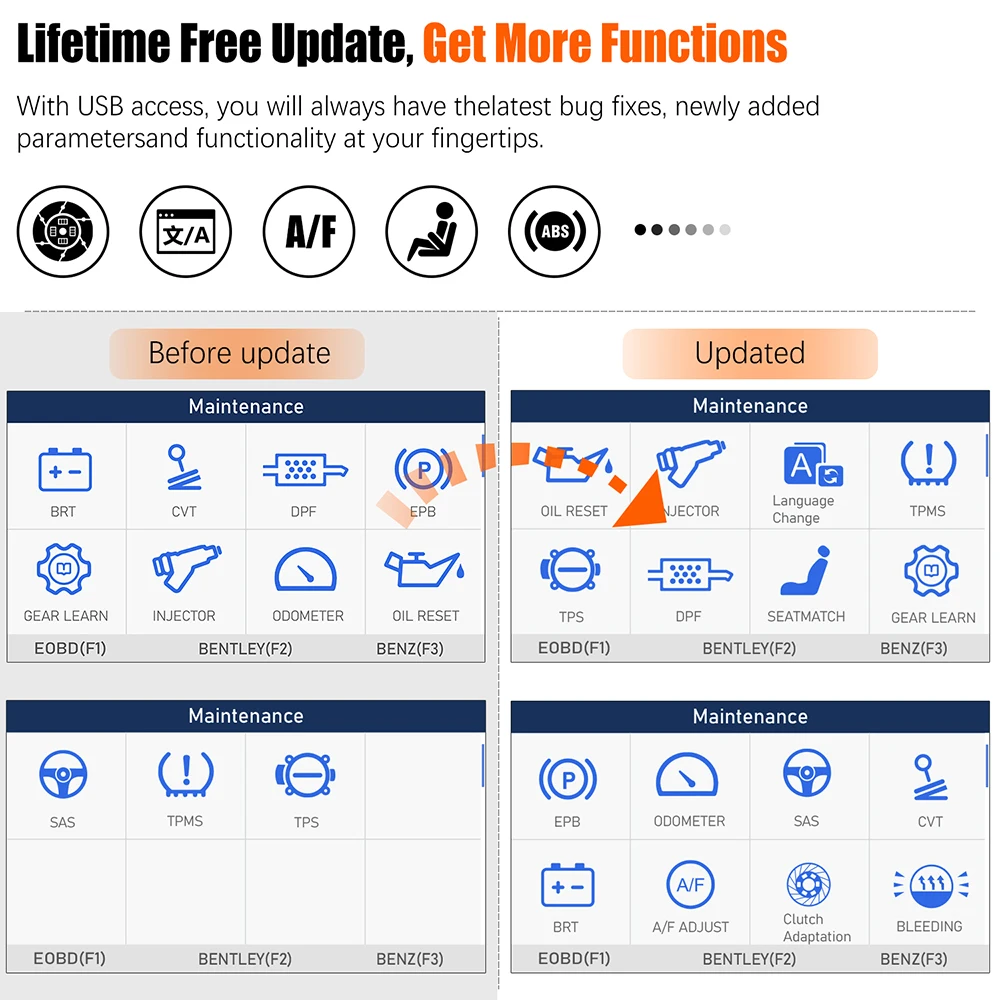 1. OBDII/EOBD Сканирование двигателя Контрольный предупреждающий светильник двигателя, появляющийся причина и данные двигателя, Проверяющий уровень выбросов двигателя, идентификационный номер VIN EIN. 2. АБС, антиблокировочный сброс тормозов Автоматическая процедура кровотечения используется на BOSH 5,3 оборудованных транспортных средств. Эта процедура использует инструмент сканирования для цикла электромагнитных клапанов системы и запуска насоса для очистки воздуха от вторичных цепей. 3. SRS Система сканирования подушки безопасности Код ошибки вашей подушки безопасности будет считываться и очищаться от его заводского состояния после аварий 4. Сброс датчика рулевого управления SAS Помогает очистить память датчика угла поворота руля и играет важную роль в калибровке датчика угла поворота руля. 5. EPB Электронный сброс тормозов Это важно для поддержания безопасности и эффективности электронной тормозной системы при замене тормозных колодок или двигателя 6. Сброс дизельного сажевого фильтра DPF Специально работает для дизельной системы Сажевых фильтров с DPF регенерацией, DPF Замена компонентов teach-in и DPF teach-in после замены блока управления двигателем. 7. Масляный светильник сброса Позволяет выполнить сброс пробега обслуживания и интервалов данных для нового расчета срока службы моторного масла после изменения масла. 8. Контроль давления в шинах TPMS Sytem Reset Делает tpms senser в отображении идентификаторов датчиков от ЭБУ транспортного средства, вставляя датчики замены TPMS и активируя датчики tpms. 9. Сброс выравнивания дроссельной заслонки TBA/TPS Датчик положения дроссельной заслонки транспортного средства подключен к шпинделю бабочки и в основном используется для контроля положения дроссельной заслонки внутри двигателя внутреннего сгорания. Благодаря своему расположением Датчик положения дроссельной заслонки способен эффективно наблюдать, где расположен Дроссельный клапан. 10. Функция передачи CVT На этих передачах CVT время выпуска и применения элементов (пакетов сцепления и полос) контролируется модулем управления передачей (микропроцессор) 11. BRT батарея Mangement сервис Позволяет сканирующее устройство для того, чтобы оценить состояние заряда батарей, Отслеживайте ток короткого замыкания, зарегистрируйтесь Новинка запасная аккумуляторная батарея, и активировать в состоянии покоя батареи транспортного средства системы 12. Кодирование инжектора Код дизельного дезинфицирующего средства, необходимый для программирования ID и параметры к Эбу для точной связи и системы контроля впрыска 13. Распределительный вал Шестерни обучения Инструмент сканирования отслеживает сигналы некоторых датчиков положения распределительного вала, чтобы определить, выполнены ли все условия, чтобы продолжить процесс работы двигателя 14. Блок инструментов одометра инициализирует Позвольте вам перезагрузить параметры кластера прибора после замены новой панели прибора 15. Регулировка A/F Соответственно, меняйте подачу топлива, чтобы изменить производство пара котла и maintanin энергетический баланс в процессе сгорания. 16. Сиденье Память сиденье является главным образом электрически-регулируемое сиденье автомобиля, который может быть mobed в предварительно установленный позиции нажатием одной кнопки. 17. Адаптация сцепления Значение сцепления oedal free-Play, что-либо мень