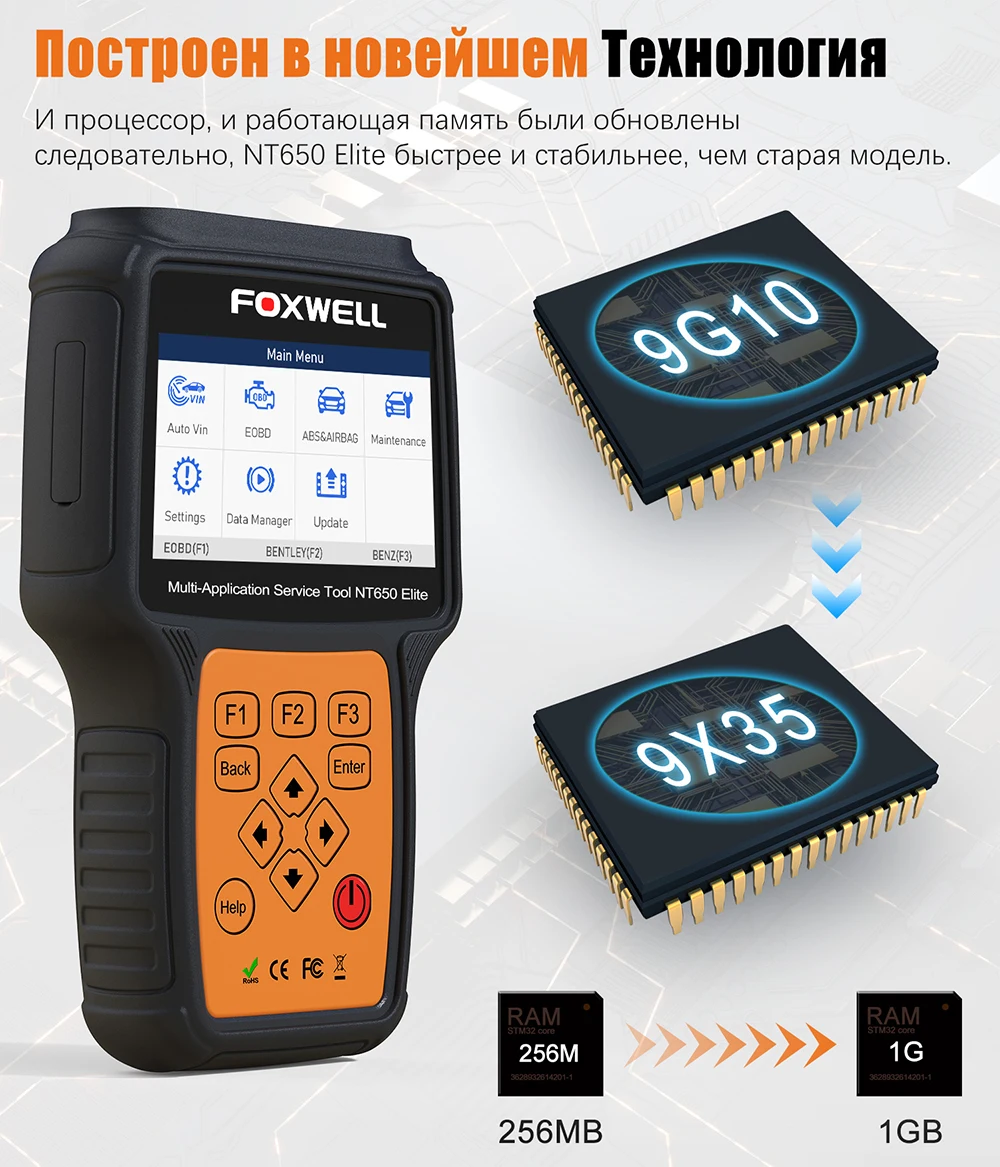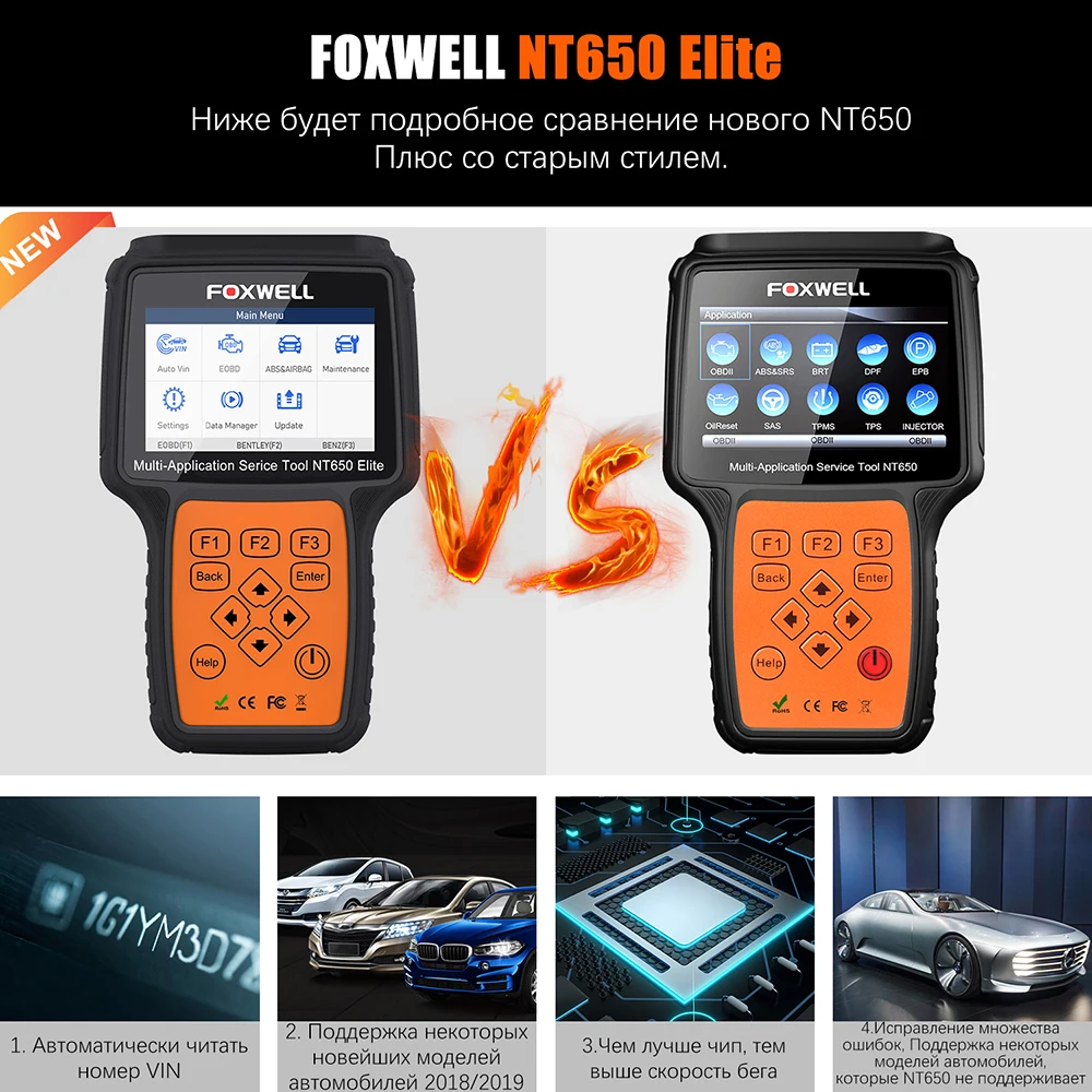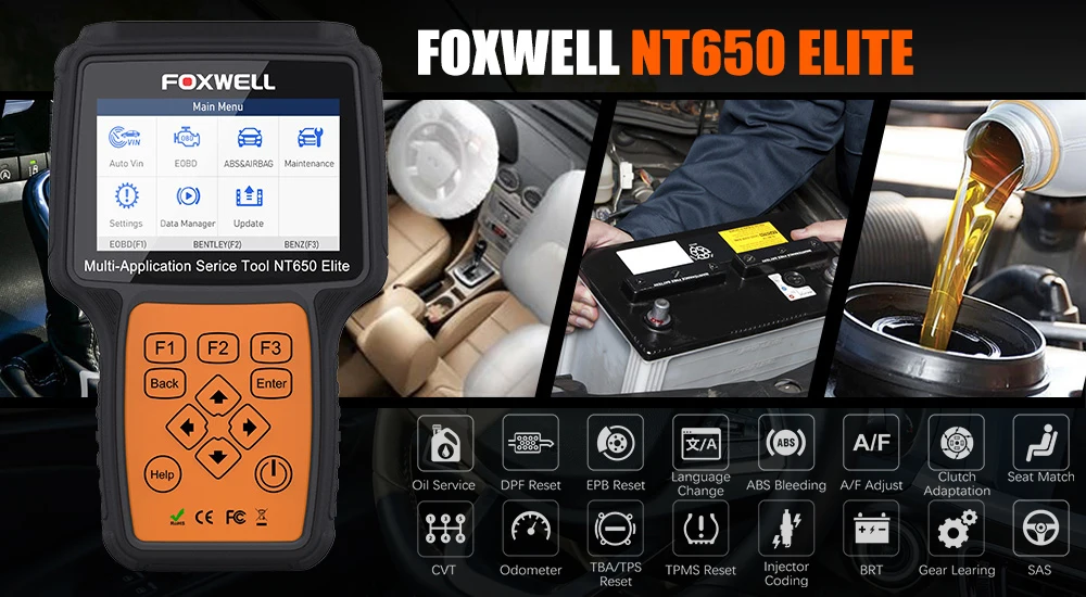 Foxwell NT650 Elite AutoMaster-это новая модель, которая предоставляет для мастерских, техников и энтузиастов Доступные профессиональные двигатели, подушки безопасности, диагностические решения двигателя ABS и более 16 специальных функций сброса системы, особенно TPMS, EPB, обслуживание масла, ABS кровотечение, подушка безопасности, DPF, дроссельная заслонка TBA/TPS, BRT, A/F регулировка, A/F регулировка, сиденье, адаптация сцепления и изменение языка, Он выделяется в различных похожих инструментах, обеспечивая более широкий охват транспортных средств, более точную диагностику, более надежную производительность и лучший опыт пользователя.