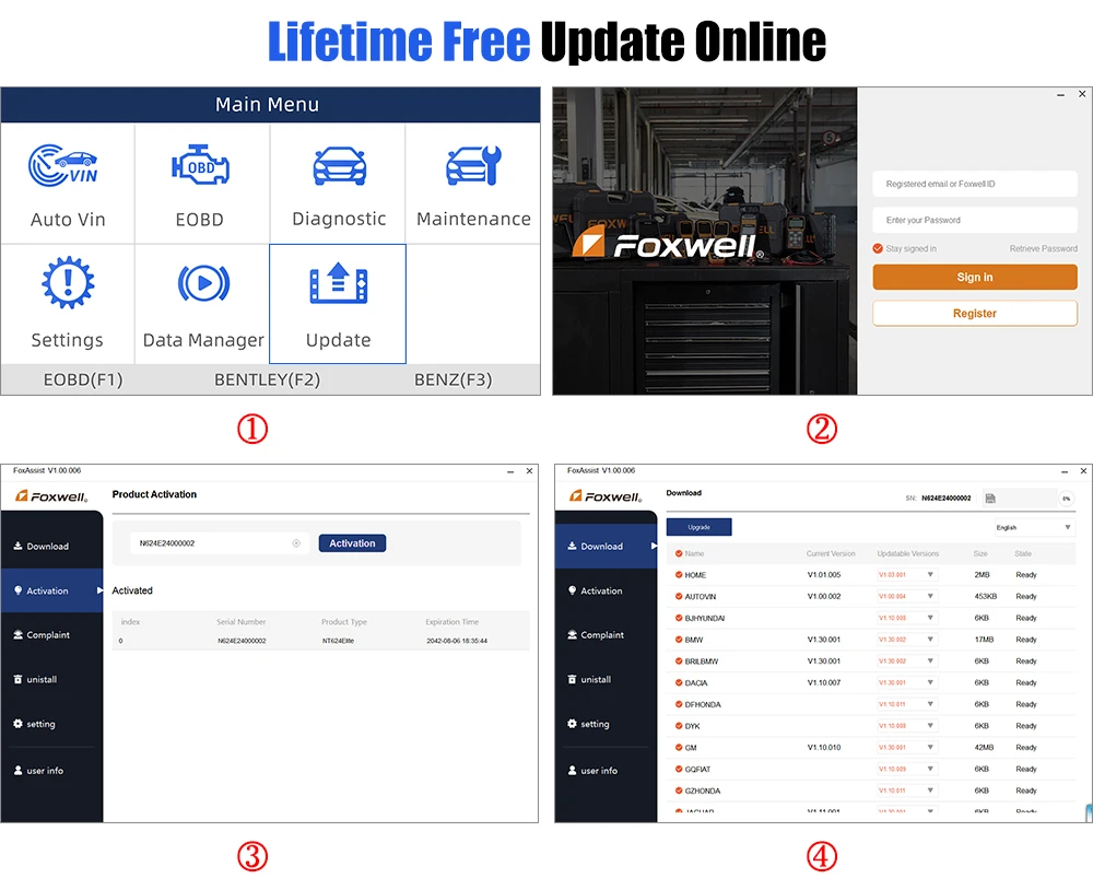 1. Перейдите на официальный сайт Foxwell: Выберите свой продукт, Под страницей нажмите на загрузку, затем Загрузите программное обеспечение FoxAssist Installer.zip update для клиентов. 2. Зарегистрируйте учетную запись foxwell и заполните соответствующую информацию в клиентском по FoxAssist. 3. Подключите NT650 Elite с компьютером по USB, нажмите «Обновить» меню. 4. Он может индентифицировать ваш номер sn автоматически, выберите ваш номер sn и нажмите активацию 5. Перейдите на страницу "скачать", выберите все программное обеспечение, а затем нажмите "обновить" 6. Подождите несколько минут, обновление будет сделано, наслаждайтесь новым программным обеспечением