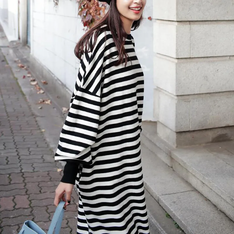 Длинное платье для женщин 2018 зима осень фонарь длинный рукав полосатый прямой свободный Повседневные платья Femme jurk