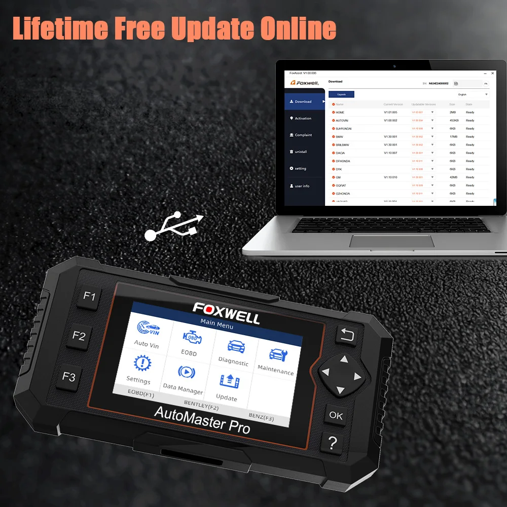 1. Перейдите на официальный веб-сайт Foxwell: Выберите свой продукт, нажмите на страницу загрузки, а затем Загрузите программное обеспечение FoxAssist Installer.zip update для клиентов. 2. Зарегистрируйте учетную запись foxwell и заполните соответствующую информацию в FoxAssist клиентском программном обеспечении. 3. Подключите NT614 Elite к компьютеру через USB, нажмите «Обновить» меню. 5. Он может индентифицировать ваш номер sn автоматически, выберите номер sn и нажмите активацию 6. Перейдите на страницу «скачать», выберите все программное обеспечение, а затем нажмите «Обновить» 6. Подождите несколько минут, обновление будет сделано, наслаждайтесь новым программным обеспечением