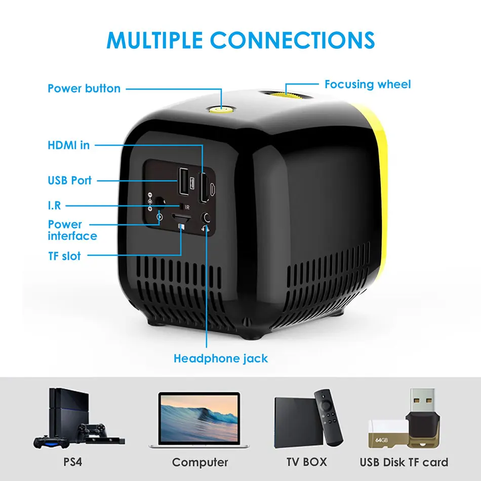 Вес нетто: 460 г Цвет: желто-черный Материал: PC + ABS соотношение изображения: 16: 9 максимальное Поддерживаемое разрешение: 1080P физическое Разрешение: 320*240 Расстояние проекции: 0,5-2,8 м Размер проекции: 15-80 Дюймы Размер продукта: 12*10*11 см интерфейс: USB * 1 / HDMI * 1 / TF * 1/аудио выход * 1 / I.R * 1 / Dc порт в * 1