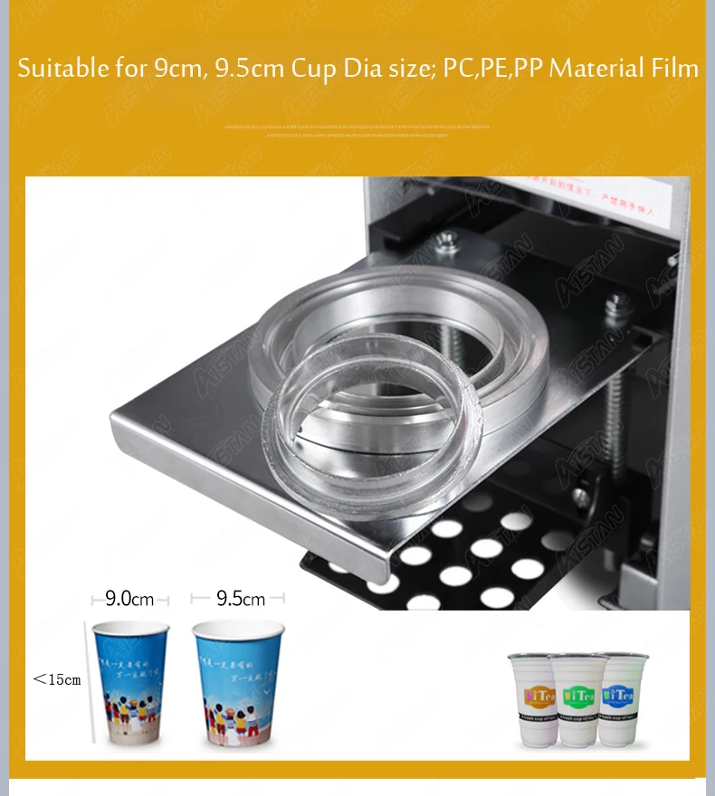 1. Датчик пленки встроен, автоматически уплотняет чашку и не будет носить уплотнительный нож 2. Корпус из нержавеющей стали, прочный и прочный 3. Герметизация quikly 4. Небольшой размер, но хорошо работает, энергосбережение; 5. Герметик-штифт на стороне для стабилизации машины, герметизация точно; 6. Прост в эксплуатации, удобен в использовании; 7. Может запечатывать три размера чашки (dia90мм, 95 мм)