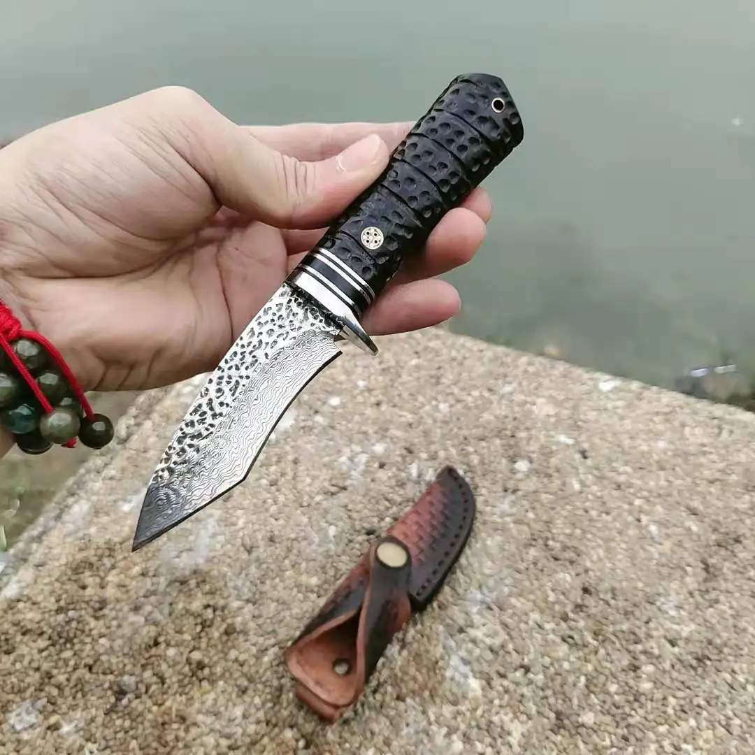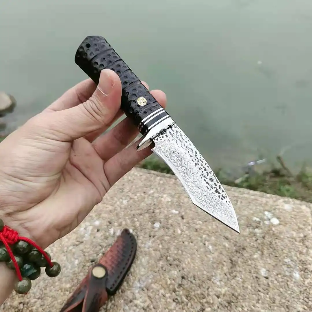 VG10 Дамасская сталь фиксированный нож ручной работы кованый охотничий нож 60HRC эбеновая ручка с кожаными инструментами оболочки