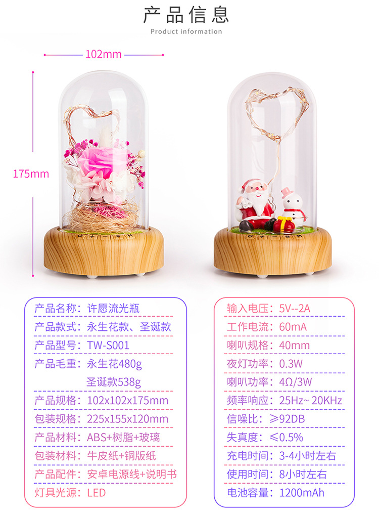 Стиль изделия: вечный цветок, Рождество, синий цветМодель продукта: TW-S001Технические характеристики изделия: 102x102x175mmСпецификация упаковки: 225x155x120mmМатериал изделия: абс + смола + стеклоУпаковочный материал: крафт-бумага + бумага с покрытиемАксессуары продукта: шнур питания Android + руководствоИсточник света: светодиодныйВход напряжение: 5V--2AРабочий ток: 60mAХарактеристики динамика: 40 ммНочной светильник Мощность: 0,3 WМощность динамика: 4Ω/3 ВтЧастотная характеристика: 25 Гц ~ 20 кГцОтношение сигнал-шум: ≥ 92DBИскажение: ≤ 0.5%Время зарядки: 3,5 часовВремя использования: 8 часовЕмкость аккумулятора: 1200 мАчВес нетто продукта: вечный цветок 272 г, Рождество 323 гВес брутто продукта: 487 г для вечной жизни, 538 г для Рождества Советы:В первый раз рекомендуется заряжать в течение 3-6 часов.Когда продукт не воспроизводит музыку, функция Bluetooth автоматически отключается через десять минут, чтобы сохранить питание.Этот продукт поставляется с защитой от перезаряда и разрядки.Этот продукт не предназначен для использования детьми в возрасте до 14 лет.Когда не используется в течение длительного времени, он должен быть полностью заряжен, и продукт должен быть выключен и храниться каждые 3 месяца.Когда батарея низкая, это повлияет на функцию Bluetooth аудио. Пожалуйста, заряжайте его вовремя.Держите этот продукт вдали от сильных магнитных полей и электрических полей. Информация об упаковке:Вес нетто: 11,7 кг для вечной жизни и 12,9 кг на РождествоВес брутто: 13,2 кг для вечной жизни и 14,4 кг на РождествоКоличество упаковки: 24 шт.Размер внешней коробки: 630*460*370 мм