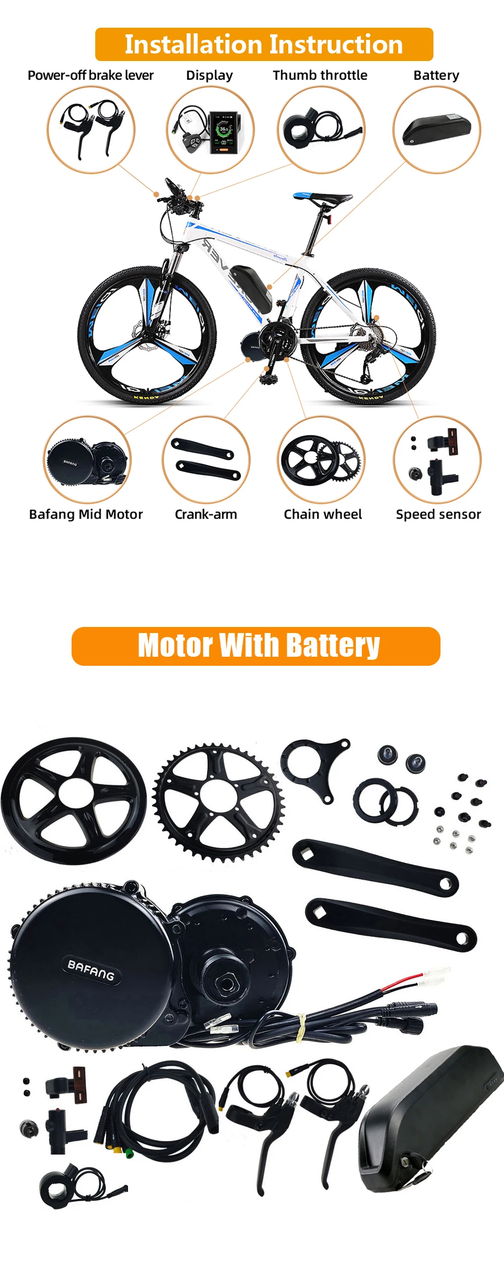 1. Bafang mid мотор 36V 250W2. Зубчатое колесо цепной передачи3. Крышка цепи4. C965/TFT850C/DPC-18 дисплей5. Кривошип6. Дроссельная заслонка7. Для девочек от 1 до 4 кабели8. Датчик скорости и магниты9. Тормозной рычаг10. Гайки11. 36V15.6AH батареяГарантия