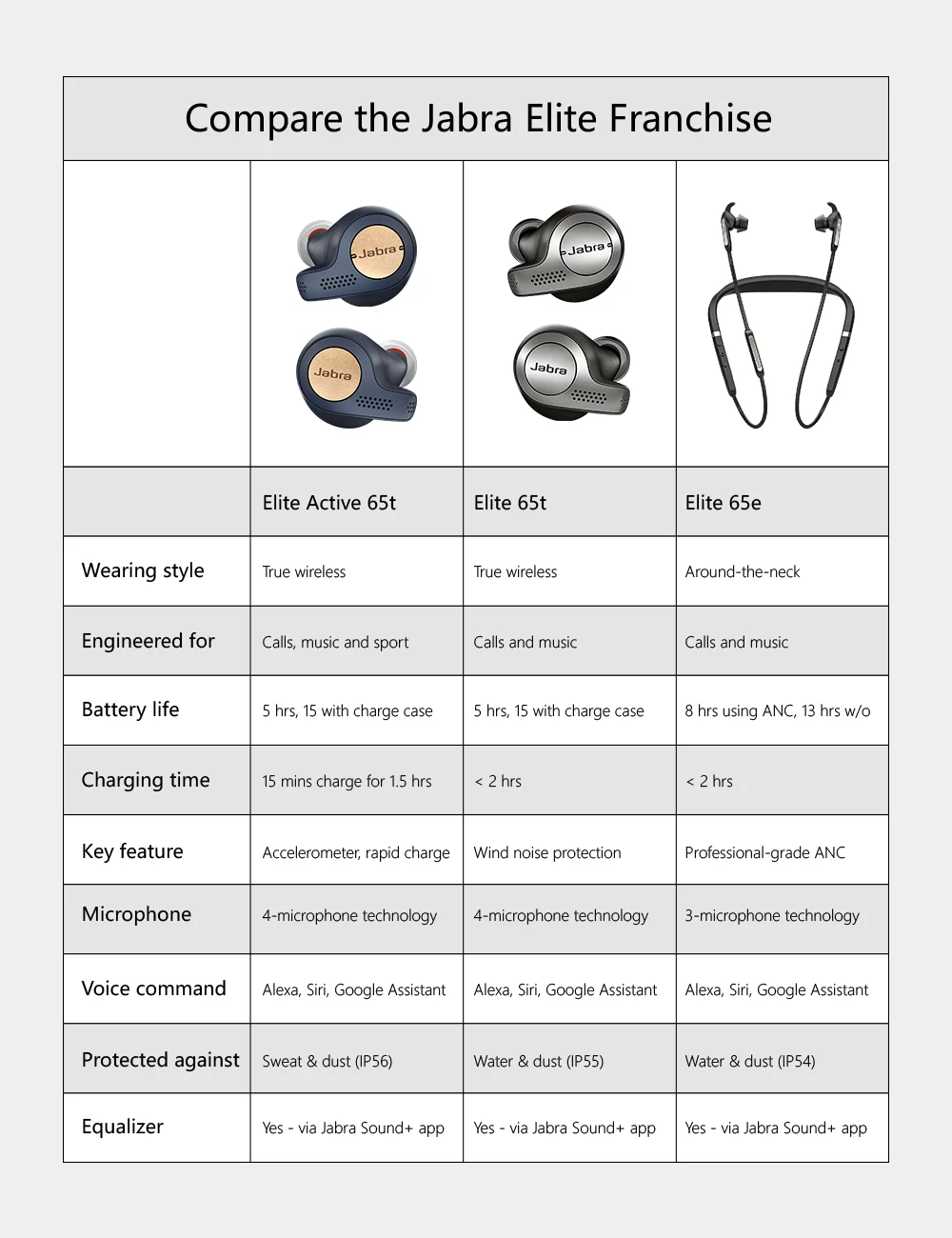 Наушники-вкладыши Jabra Elite 65t, беспроводные Зарядный чехол Кабель Micro-USB 3 набора силиконовых eargel Руководство по быстрому запуску Гарантийные и Предупреждение ющие листовки, этикетка TA