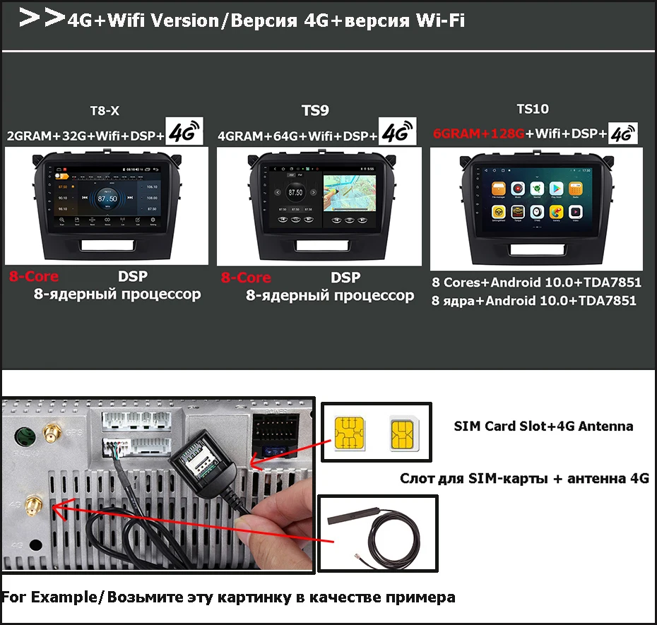 > TS10(Wifi с 4G)= 8 ядер <4 ядра + 4 ядра> + 6G RAM + 128G ROM + DSP + поддержка установки 4G sim-карты + Wifi + AHD камера заднего вида подарок + Встроенный Carplay + встроенный В Android Auto/