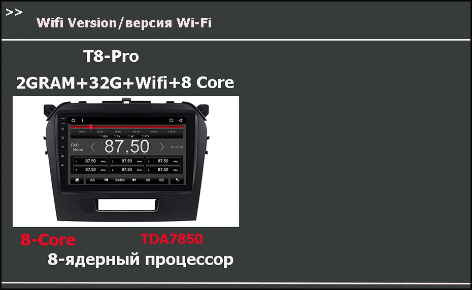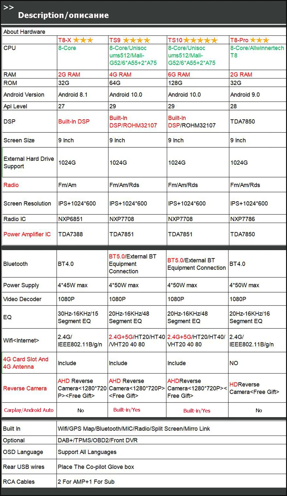 > T8-X(Wifi с 4G)= 8 ядер <4 ядра + 4 ядра> + 2G RAM + 32G ROM + DSP + поддержка установки 4G sim-карты + Wifi + AHD камера заднего вида подарок/