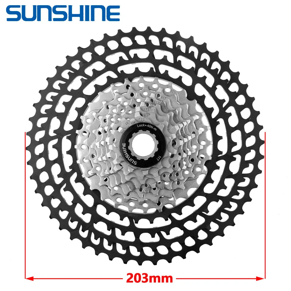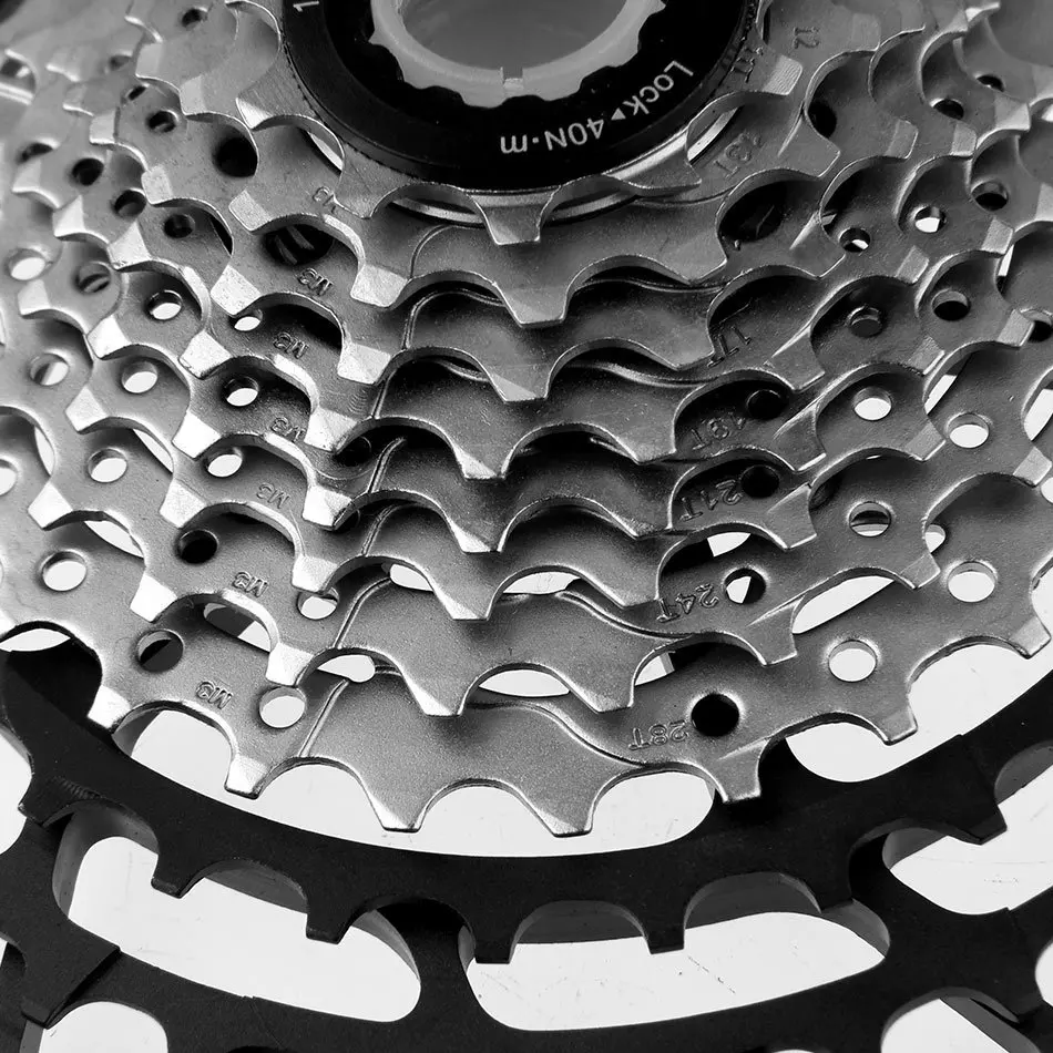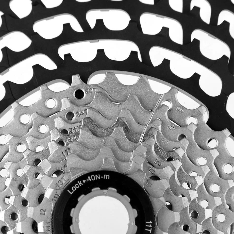 Количество зубьев: 11-50T, 5т Вес нетто: 396 г/0,86 (фунтов) (± 10 г) Материал: (32T-50T) высокопрочный алюминиевый сплав, черный. (11T-28T) Высокая Тяговая сталь (черный/серебристый)