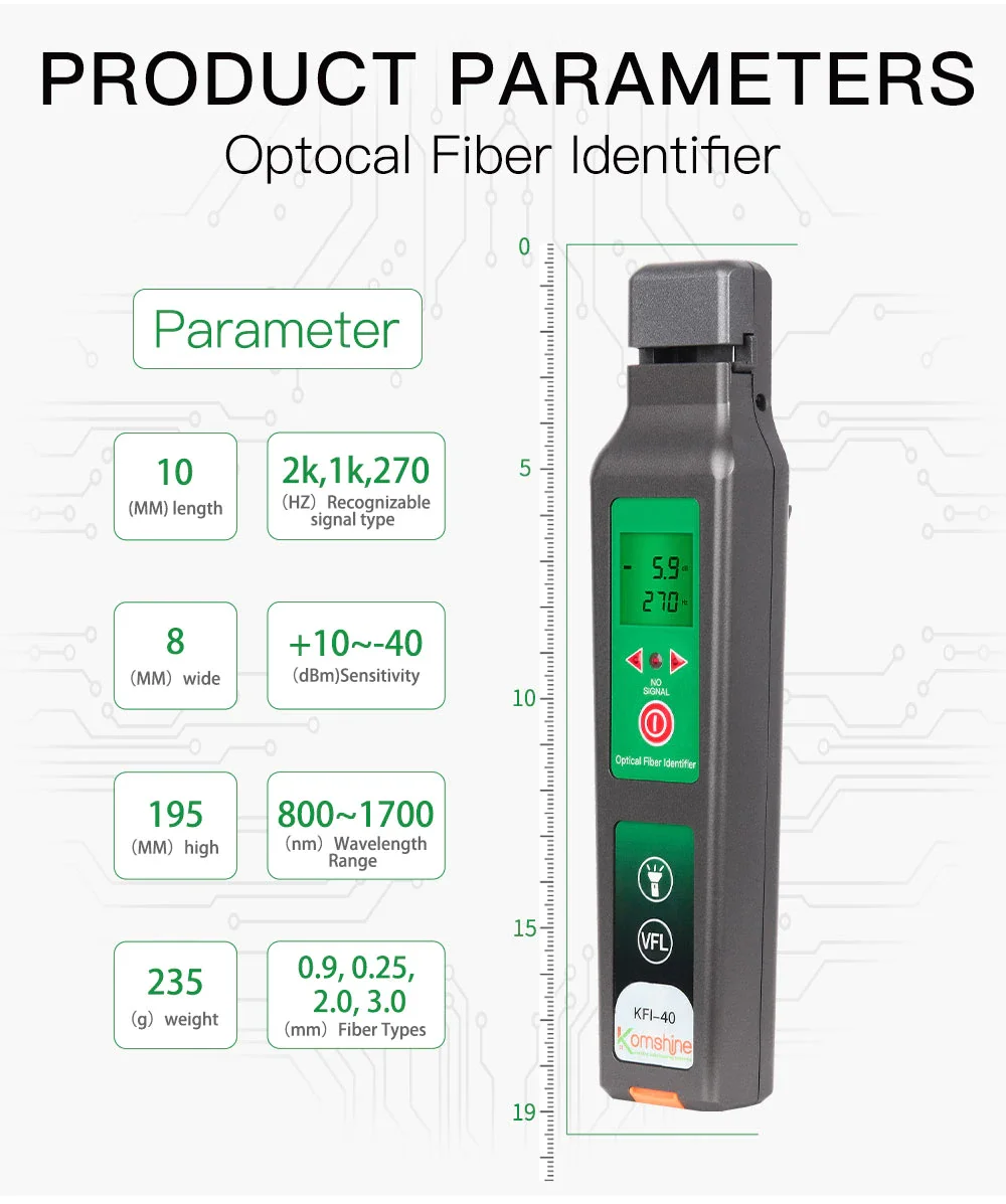 KomShine KFI-35 идентификатор оптического волокна также распознает модуляцию, 270 Гц, 1 кГц и 2 кГц. Когда они используются для обнаружения частоты, непрерывный звуковой тон активируется.