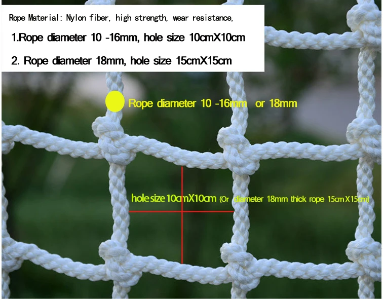 Диаметр веревки 16 мм, размер отверстия 10 см x 10 см, размер сетки 1X1m, 1x3m, 2X3m,2X4m,3X3m