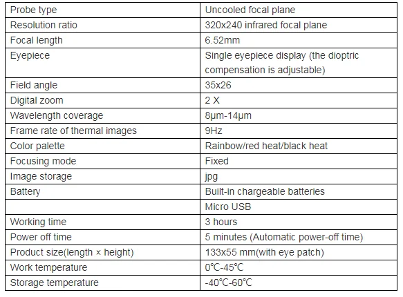 Описание продукта: HT-320D инфракрасное тепловое изображение устройство ночного видения принимает advance non-cooled focal plane инфракрасный детектор и качественные оптические линзы в качестве ядра. С характеристиками удобной и быстрой операционной системы, небольшой внешний вид дизайн, детали расширения с идеальной функцией, длительный срок использования, он прочен и долговечен и применим ко всем типам окружающей среды и обеспечивает идеальный инструмент измерения температуры с «четкое изображение, точное измерение, простая работа и простота в переноске». Это лучший выбор для обнаружения на месте, предотвращения технического обслуживания и других мест применения. Продукт может использоваться для наблюдения за животными на открытом воздухе, поиска и спасания, обнаружения сотрудников полиции, ночного патруля, активного отдыха и личной безопасности и т. Д. Продукт снабжен функцией фотографирования. Фотографии могут быть сделаны с помощью подключения к компьютеру через USB, чтобы сделать его удобным для наблюдения многих людей одновременно, что создает возможность для применения в более случаях. Индекс производительности