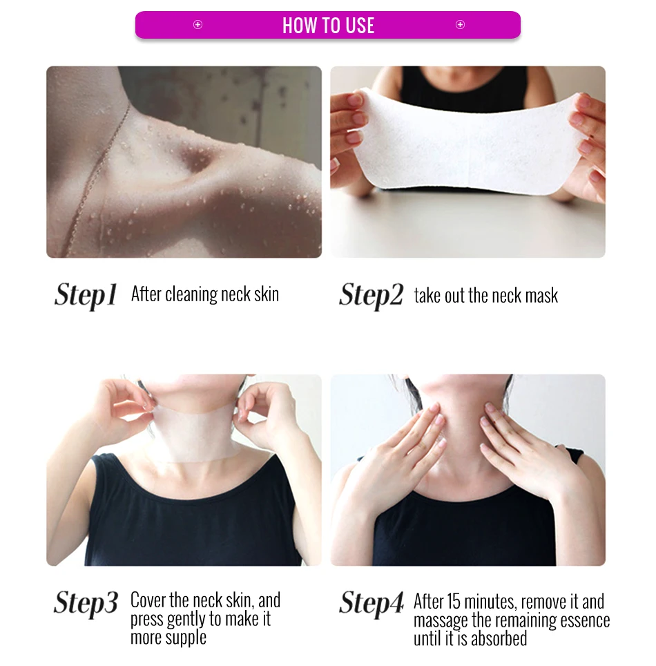 Очистите кожу шеи, выньте маску для шеи, закройте кожу шеи и аккуратно нажмите, чтобы сделать ее более упругой. Через 15 минут удалите его и массируйте оставшуюся эссенцию до впитывания. Нанесите на любой тип кожи