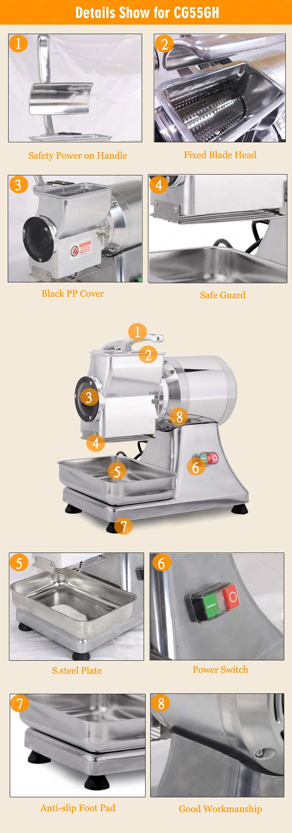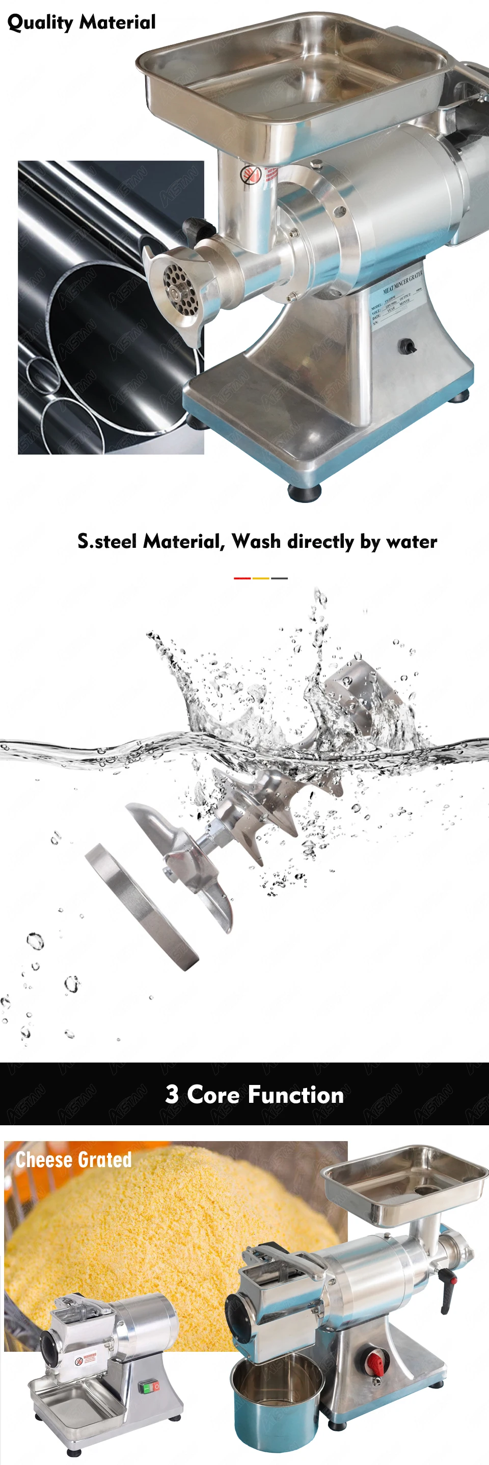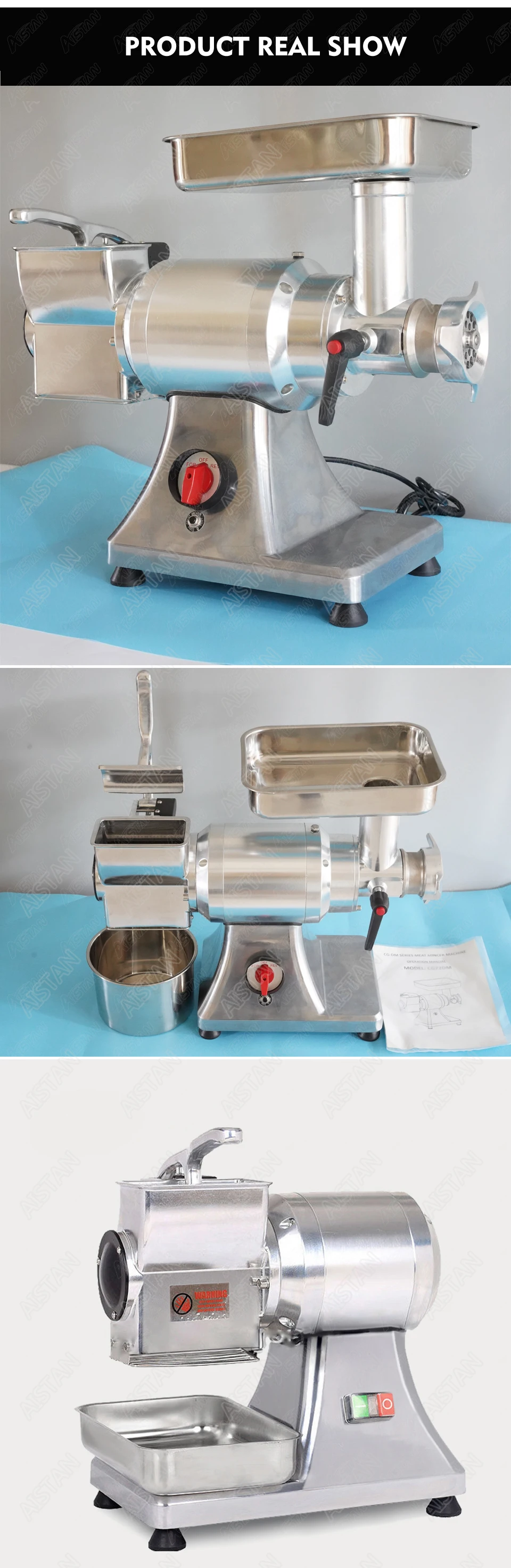 1. Многофункциональное пищевое оборудование, может быть вашей мясорубкой, теркой для сыра, а также колбасой. 2. Высокая мощность, низкая скорость, вращающаяся технология, повышает эффективность мясорубки и обеспечивает безопасность. 3. Утолщенный материал из нержавеющей стали, можно мыть непосредственно водой. 4. Лезвие пищевого качества, чистый и гигигеевый. 5. Медный двигатель, высокая эффективность и долговечность.
