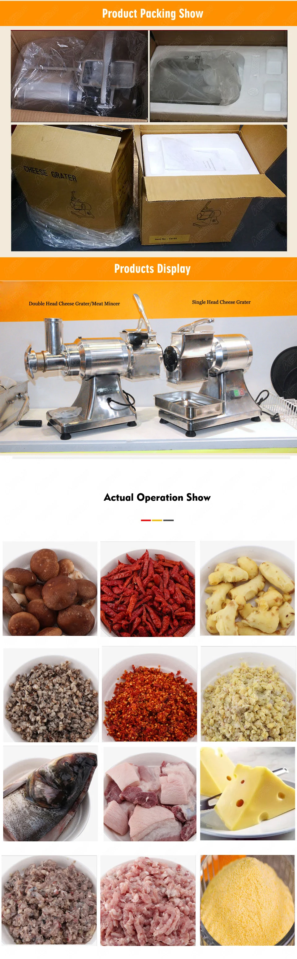 Терка для сыра с двойной головкой мясорубка Ёмкость: 180 кг/ч Мощность: 900W Вес: 27кг Размеры: 685x335x590mm Аксессуар: 1 лоток из нержавеющей стали + 1 нажимная палка Материал: полированный алюминий и нержавеющая сталь