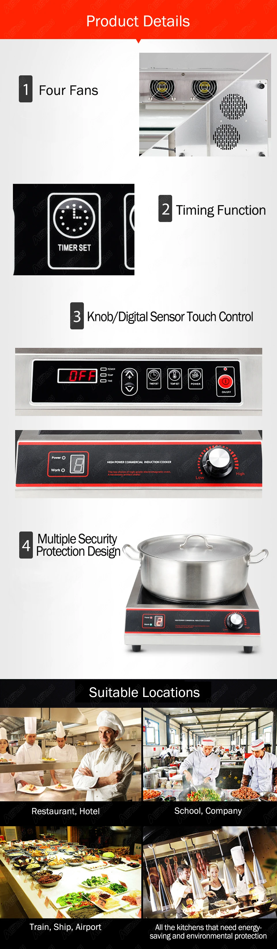 Материал корпуса и панели печи: индукционная плита изготовлена из толстой нержавеющей стали, материал панели изготовлен из закаленного стекла черного цвета, чтобы убедиться, что эта электрическая плита обладает сильной ударопрочностью, не ржавеет, легко чистится и может нести больше веса, чем у другой обычной индукционной плиты. Водонепроницаемость: водостойкая панель управления индукционной горелки может полностью защитить внутренние электрические компоненты, уменьшая возникновение неисправностей; Корпус индукционной горелки изготовлен из цельной штампованной нержавеющей стали, нет сварки, это также гарантирует, что вода не проникает внутрь индукционной плиты. Уровни мощности: вы можете быстро выбрать подходящий уровень от 400 Вт до 3500 Вт/5000 Вт. 3500 Вт/5000 Вт Мощность для удовлетворения ваших различных потребностей в приготовлении пищи; Варить на медленном огне, варить, варить, сеять, закатывать, парить, медленно варить и гриль с легкостью