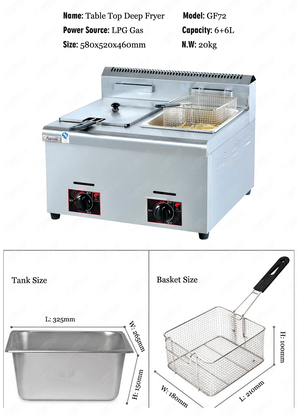 Газовая столешница фритюрница Размер: 580x520x460мм Емкость: 6 + 6 л Вес нетто: 20 кг Источник газа: LPG