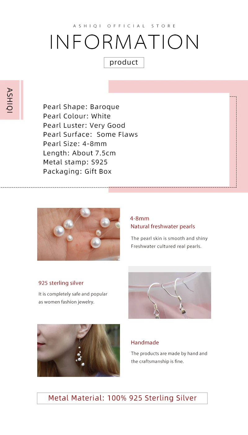 Бренд: ASHIQI Тип камня: натуральный пресноводный жемчуг Жемчуг Форма: барокко Жемчуг Цвет: белый Жемчужный Блеск: очень хорошо Поверхность жемчуга: некоторые изъяны Размер жемчуга: 4-8 мм Длина: около 7,5 см Материал металла: 100% 925 пробы Серебряный Металлический штамп: S925 Упаковка: Подарочная коробка