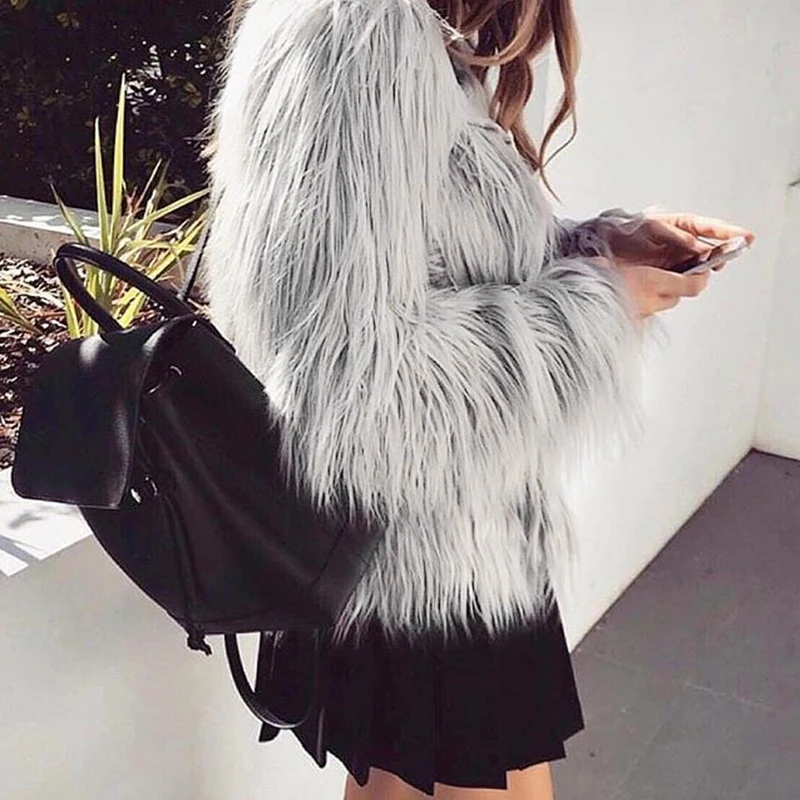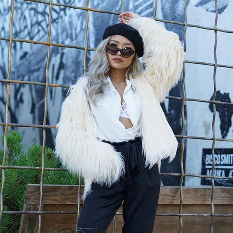 Эта куртка изготовлена из лохматого искусственного меха в универсальном однотонном цвете и имеет широкий отложной воротник и рукав три четверти. Потайные застежки-крючки для обтекаемой отделки. Стиль ваш с эффектными аксессуарами для роскошного подход.
