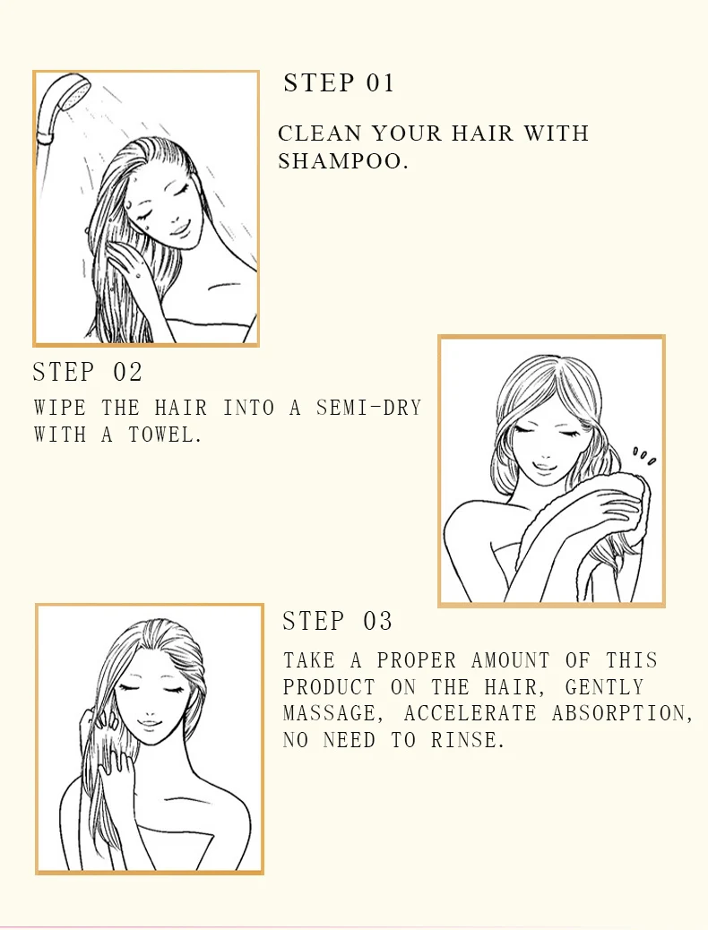 2. Мягко массируйте для ускорения поглощения, увеличения блеска волос, не нужно мыть снова.