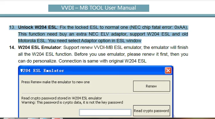 Разблокировка W204 ESL: исправление заблокированного ESL к нормальному (ошибка с чипом NEC fatal: 0xAA). Эту функцию нужно купить дополнительный адаптер NEC ELV, поддержка W204 ESL и старой Motorola ESL. Вам нужно выбрать вариант адаптера в окне ESL