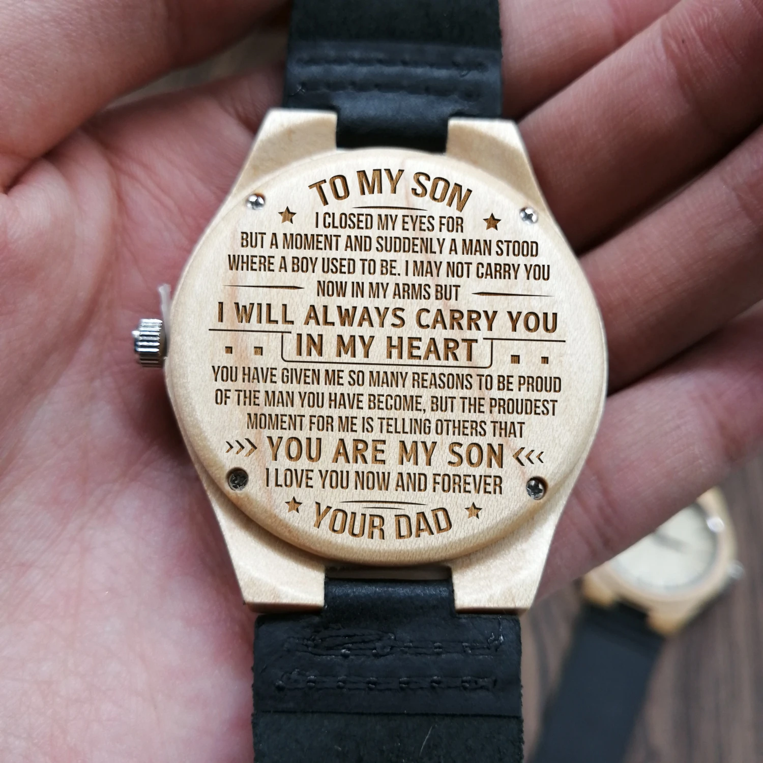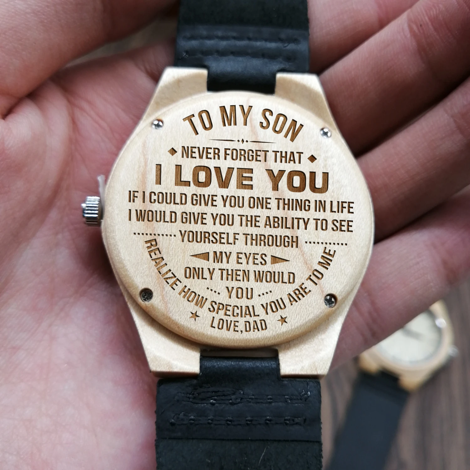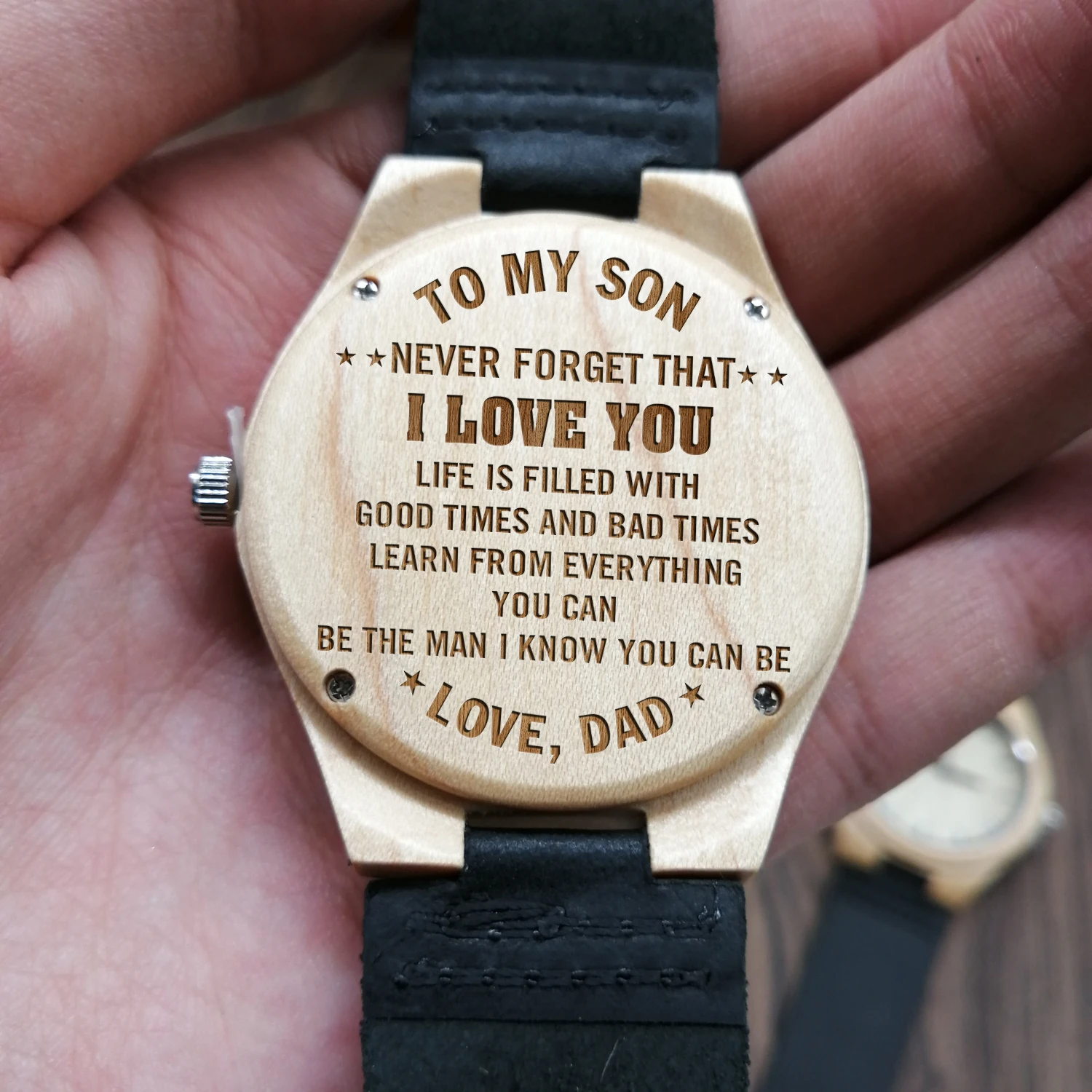 * Милая гравировка, несомненно, растопит его сердце. * Настоящий деревянный материал для уникального ощущения и длительного ношения. * Легкий и мягкий кожаный ремешок. * Застежка из нержавеющей стали с пряжкой для плотного прилегания даже в прочные дни. * Элегантная устойчивая к царапинам кристальная поверхность Hardlex * Регулируемый ремешок, каждый часы оснащен инструментом регулировки ремешка, так что вы можете легко настроить размер, чтобы соответствовать вашему размеру запястья