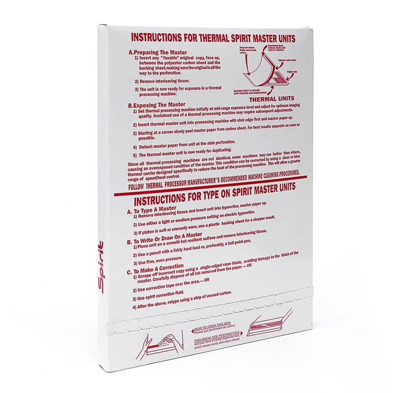 Термальность Бумага имеет 4 части: 1) Топ Слои белого цвета. Это Слои, что ваш образ будет возвращена на улицу. 2) второй слой не связан и является молочно-белым. Как правило, это Слои выбрасывается. 3) третий слой-углерод (фиолетовая/синяя бумага). Нажав на этот Слои фиолетовый/синий покрытие вес переносится на верхний лист. 4) четвертый нижний лист желтый и удерживает Оригинал на месте при использовании копия трафарета машины.