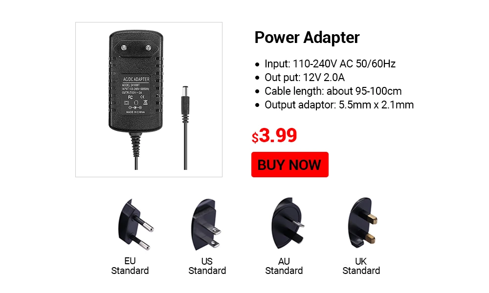 Эта камера не имеет адаптера питания (версия DC12V), если вам нужно, пожалуйста, нажмите на картинку, чтобы купить.