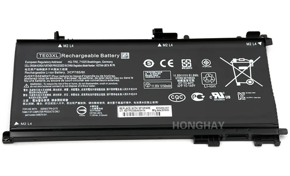 HONGHAY Номер модели: TE03XL Тип батареи: Литий-полимерный аккумулятор Напряжение батареи: 11,55 в Емкость аккумулятора: NOM 61.6Wh 5150 мАчЦвет: