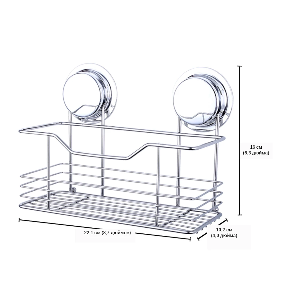 Модель: настенная полка из нержавеющей стали Размеры: Длина: 22,1 см (8,7 дюйма) Ширина: 10,2 см (4,02 дюйма) Высота: 16 см (6,3 дюйма) Мощное всасывание: Присоски могут поддерживать до 22 фунтов (10 кг) Прочный Материал: Изготовлены из прочной нержавеющей стали и АБС-пластика на присосках.