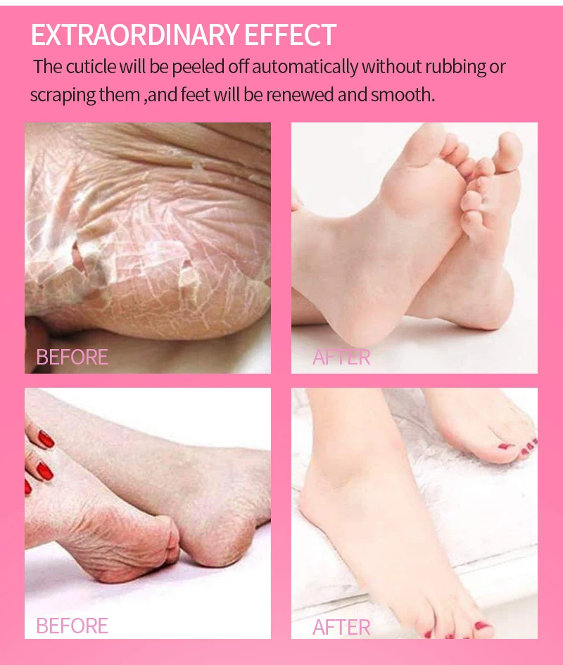5. Большинство людей начинает очищать омертвевшую кожу после 48 часов использования, но из-за различного типа кожи, кому-то может потребоваться использовать 2-3 пары, пожалуйста, используйте маску для ног снова через 48 часов.