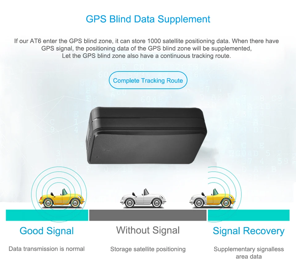 Если наш AT6 входит в слепую зону GPS, он может хранить данные спутникового позиционирования 1000. Когда есть gps-сигнал, данные позиционирования слепой зоны GPS будут дополнены. Пусть слепые зоны GPS также имеют непрерывный путь отслеживания.