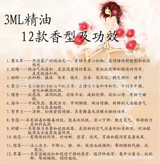 12 видов ароматов:1 Лаванда, 2 розы, 3. Жасмин, 4 Gui. Цветы, 5. Сандаловое дерево, 6. Океан, 7. Лимоны, 8 чая, 9. Лотос, 10. Розмарин, 11. Фиолетовый, 12. Гвоздика