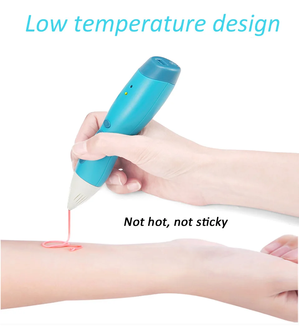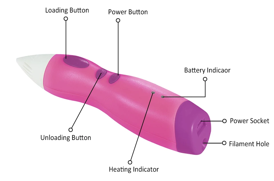 1. Поддержка работы с блоком питания 2. Поддержка кладется и выкладывается печатная нить автоматически 3. Экран дисплея отсутствует 4. Встроенный аккумулятор 5. Пластиковый корпус 6. Нельзя регулировать скорость и температуру печати 7. Защита от низкой температуры, безопасная для детей 8. 1,75 мм PCL низкотемпературная печатная нить