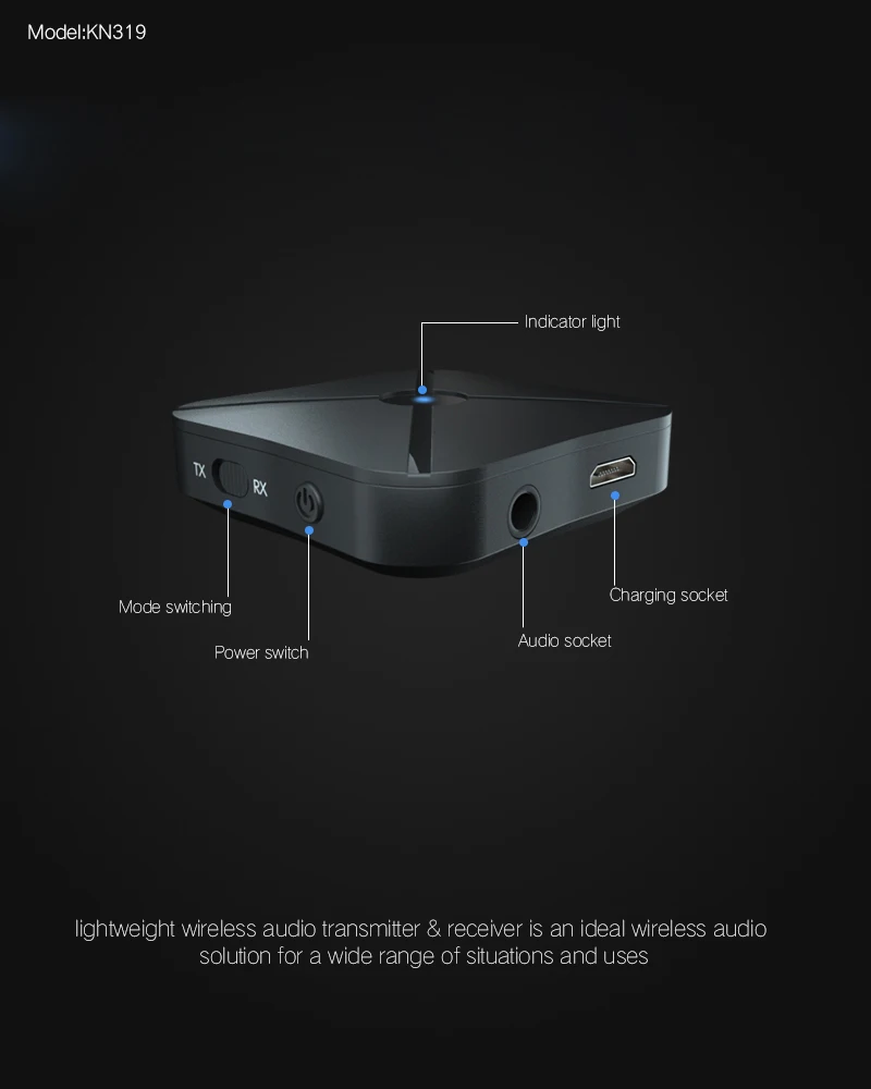4. Переключение между режимами передатчика и приемника с простым щелчком переключателя. Легко подключается с помощью передовой технологии Bluetooth и аудиокабеля 3,5 мм (в комплекте).