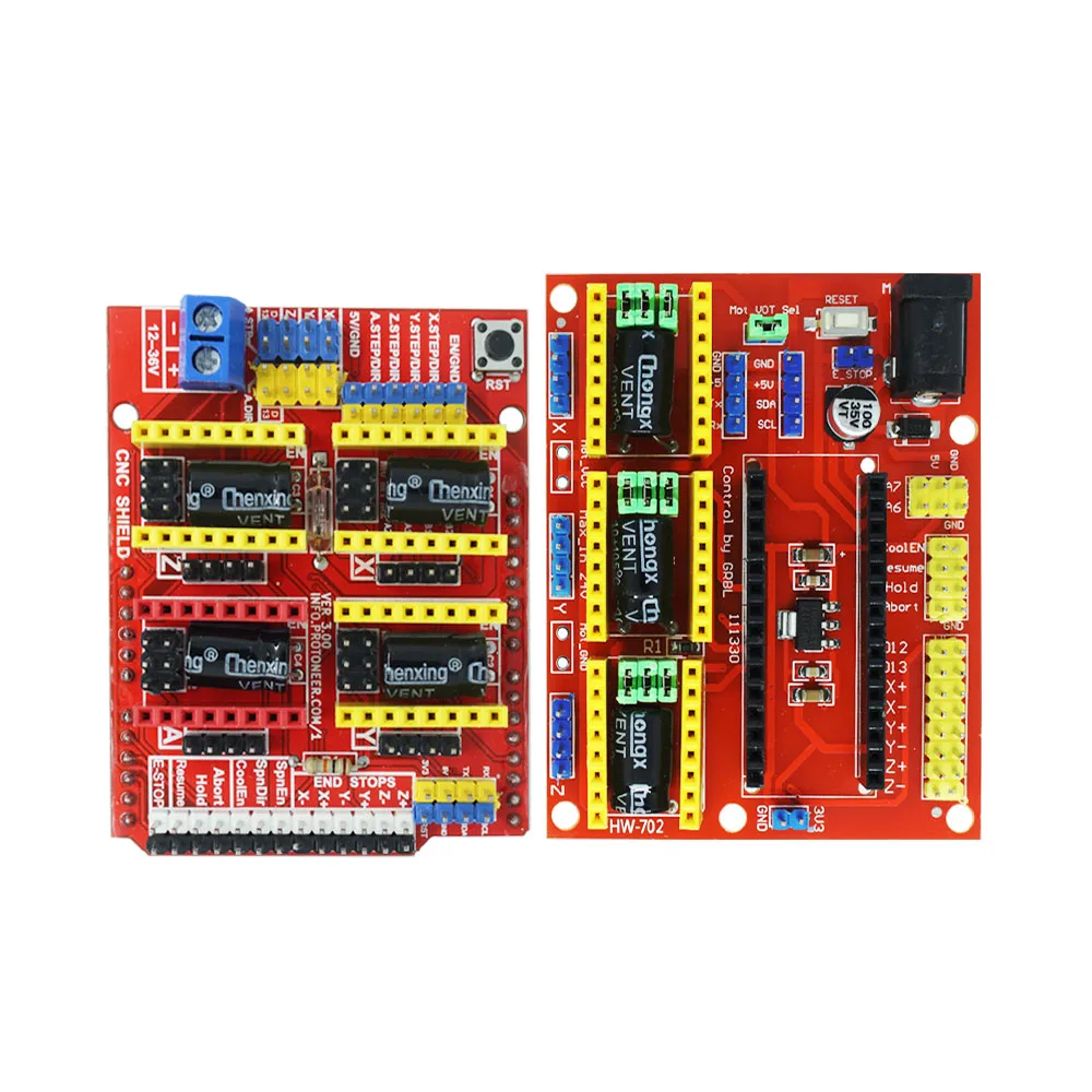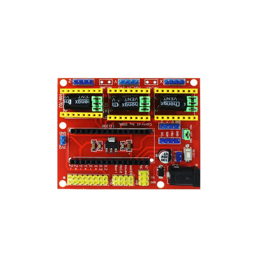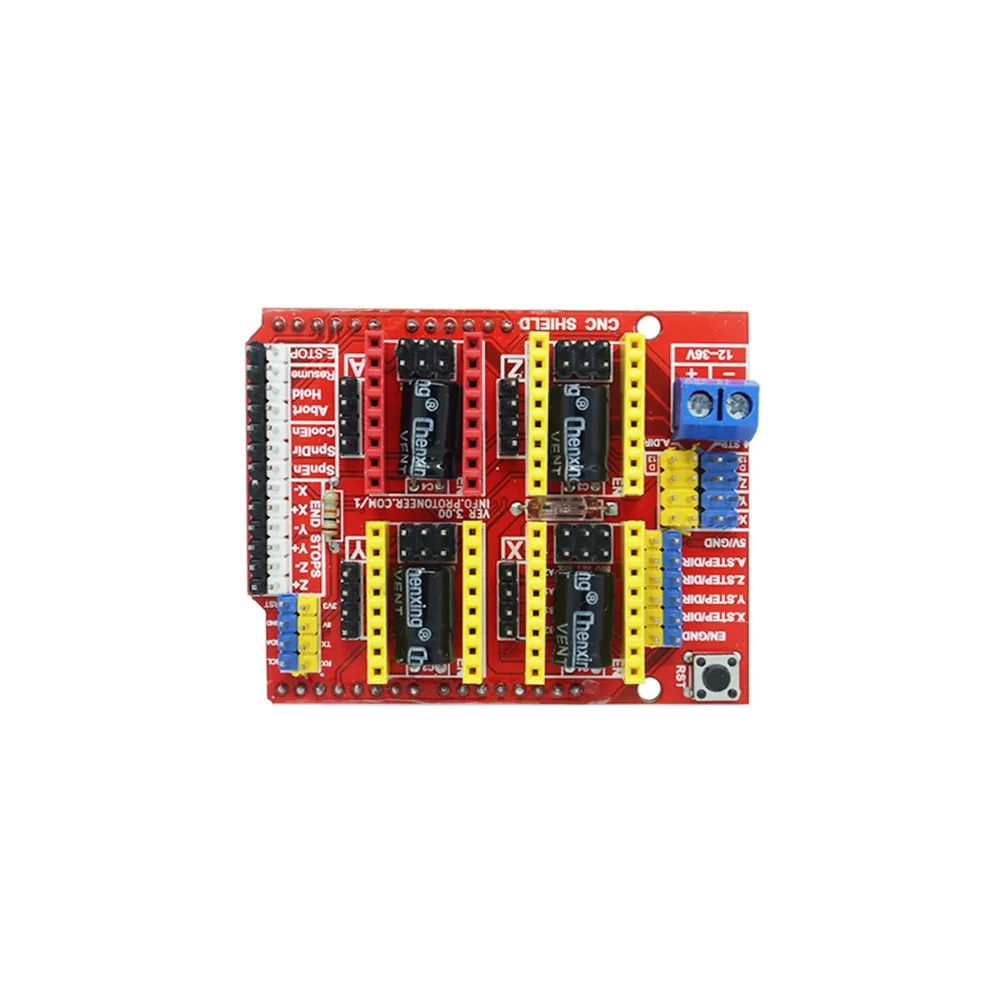 CNC shield V4 должен работать с Nano board. Может использоваться в качестве платы расширения для гравировальных машин и 3D принтеров. Он имеет в общей сложности 3 канала слотов для A4988 шагового двигателя Модули драйвера (не включены) для вождения 3 канала шагового двигателя. Для каждого канала шагового двигателя требуется только 2 порта IO, что означает, что 6 портов IO достаточно для управления 3 шаговыми двигателями s. Этот щит может сделать быструю работу для управления шаговыми двигателями вашего проекта.