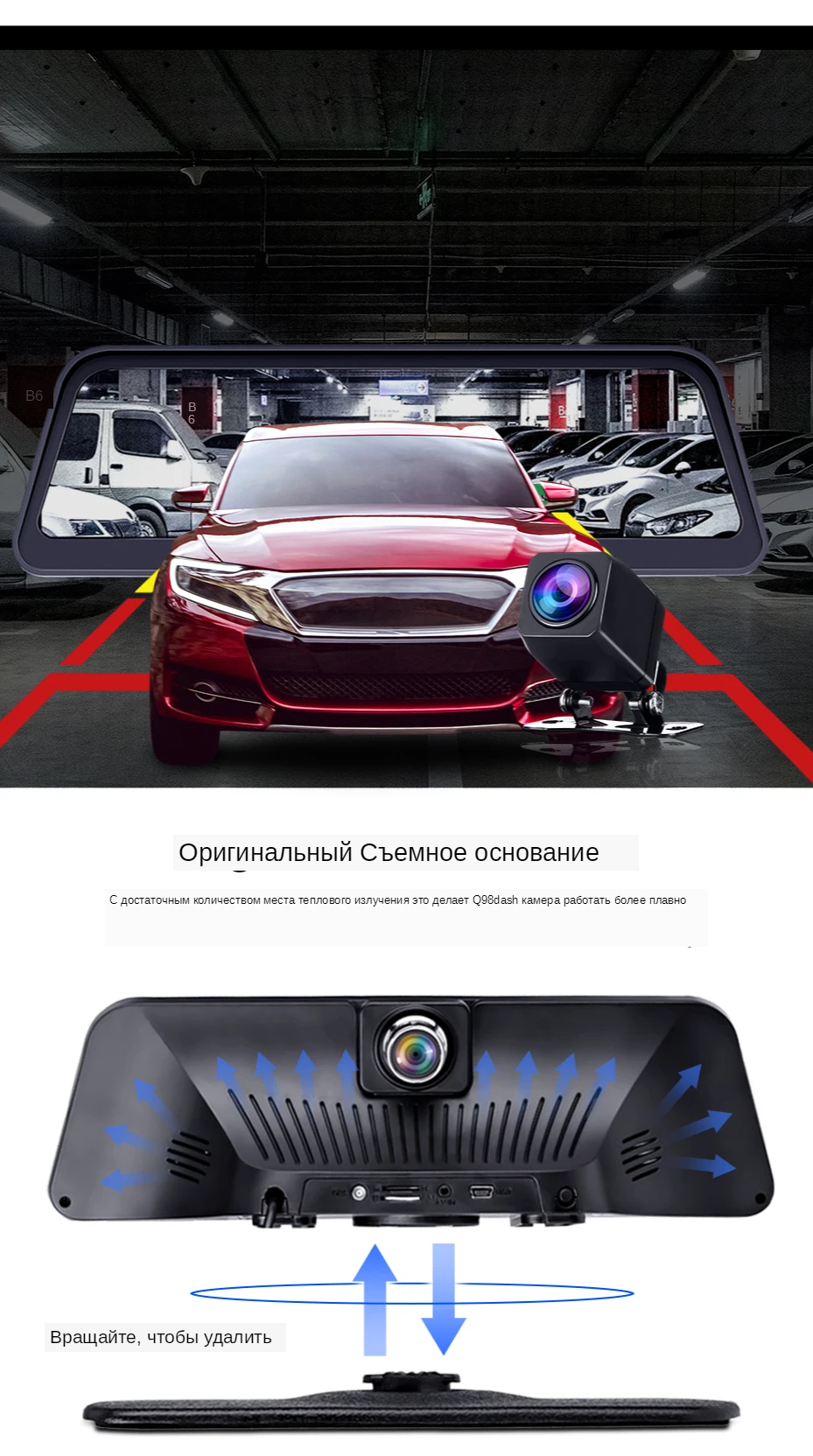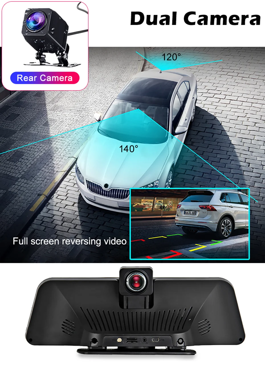 Этот автомобильный видеорегистратор имеет две камеры, которые позволяют одновременно записывать видео с двух разных углов. Спереди 140 градусов; Сзади 120 градусов.