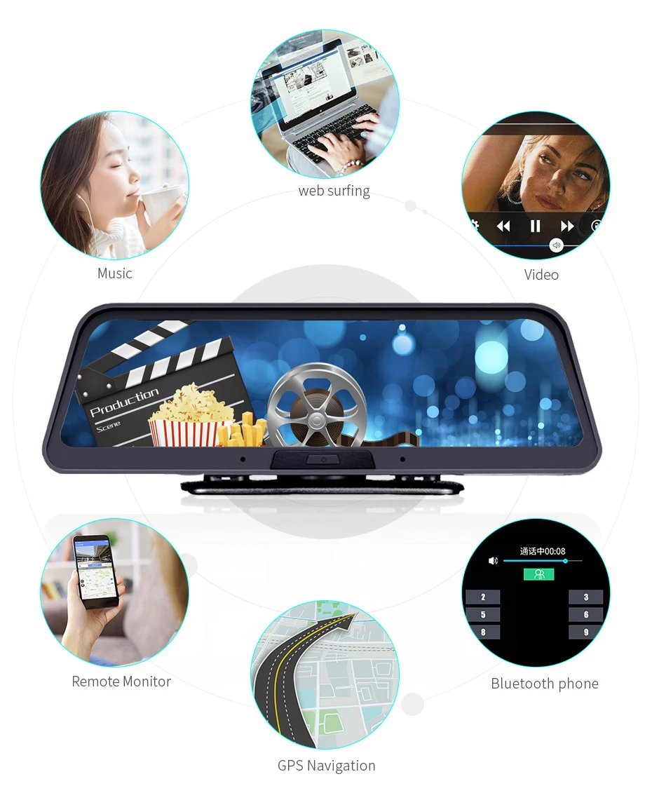 Он встроен в модуль bluetooth, После сопряжения bluetooth с мобильный телефон, он может поддерживать телефонный звонок на автомобильном зеркале dvr, или передавать музыкальные песни на Автомобильный видеорегистратор с мобильного телефона.