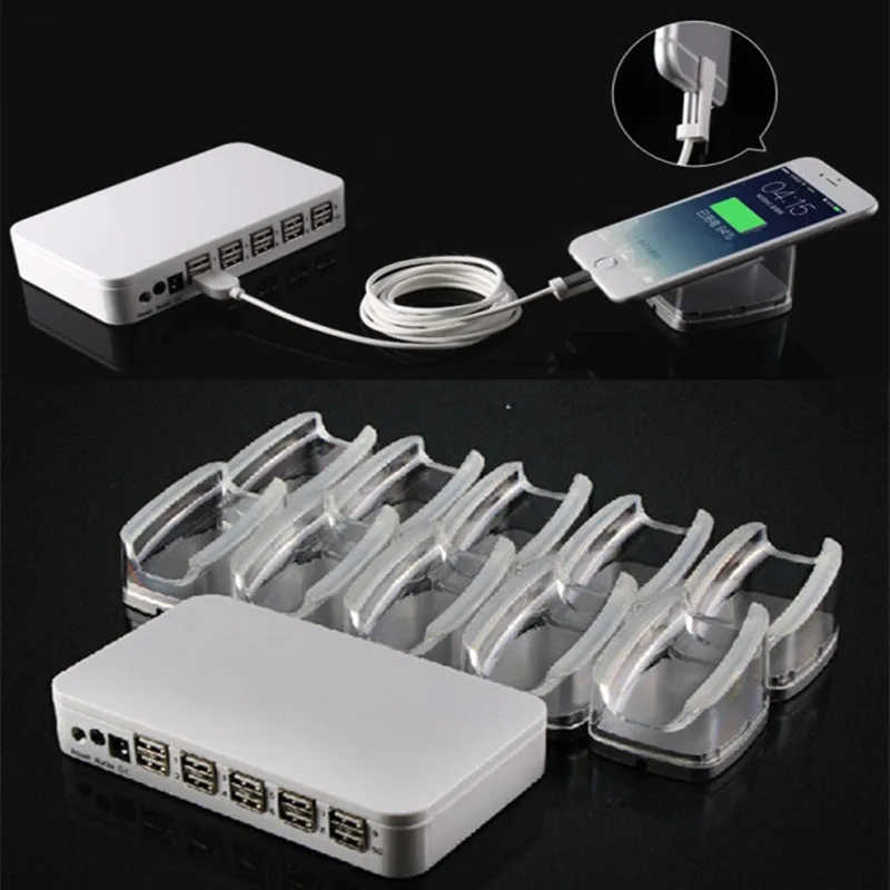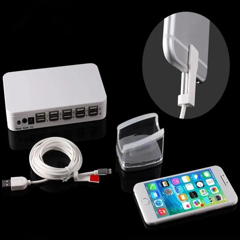 Система безопасности предназначена исключительно для мобильных смартфонов, планшетных устройств и аксессуаров. Она функционирует как Противоугонный замок, а также как зарядное устройство. Главный хост 10 портов подключается к источнику питания. 10 шт. зарядный и сигнальный кабель для телефона 10 шт. Телефон. Обеспечивает зарядку и безопасность. 10 шт. акриловый держатель поддерживает телефон. Пульт дистанционного управления стоп-сигнал. Аккумулятор Bulti-in обеспечивает продолжительную сигнализацию при отключении питания.