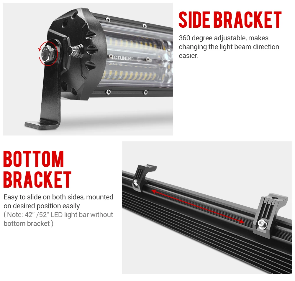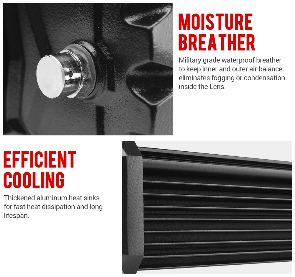 Через практический тест, шум ветра уменьшается на 60% по сравнению с другими светильник бар. Просто наслаждайтесь счастливыми внедорожными приключениями.