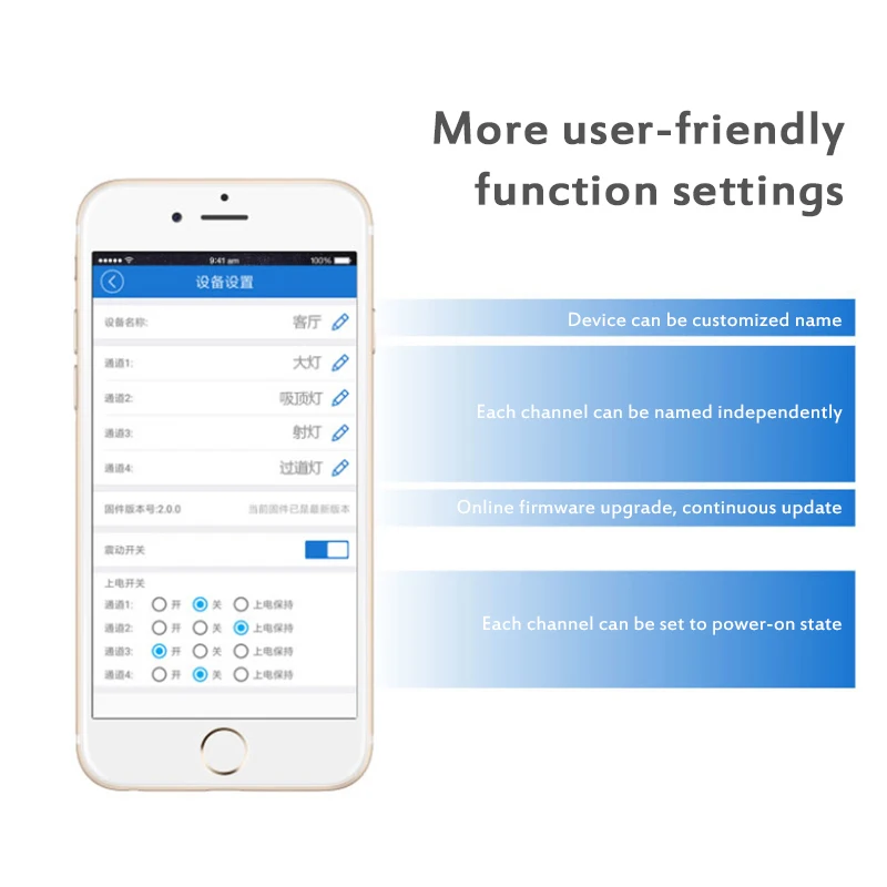 Включение/выключение 4 бытовых приборов удаленно состояние устройства синхронно отображает Расписание/таймер обратного отсчета управление разделяемым устройством Поддержка настройки питания на состояние работает с Amazon Echo, Echo Dot, Amazon Tap работает с Google home, google Nest работает с IFTTT Параметры Питание: 90 ~ 250 В переменного тока (50/60 Гц) Макс. Ток: 10A/банда Макс. Мощность: 2200 Вт/банда, 2200 Вт/общая Беспроводная стандарт: 802,11 b/g/n механизм безопасности: WPA-PSK/WPA2-PSK Материал корпуса: огнестойкий ABS V0 банда: 4 размеры: 145*90*40 (мм) Рабочая температура (рекомендуется): 0 °C-40 °C(32 °F-104 °F) Рабочая влажность: 5%-90% RH, сертификация без конденсации: CE/FCC/RoHS (загрузите сертификат и отчеты)