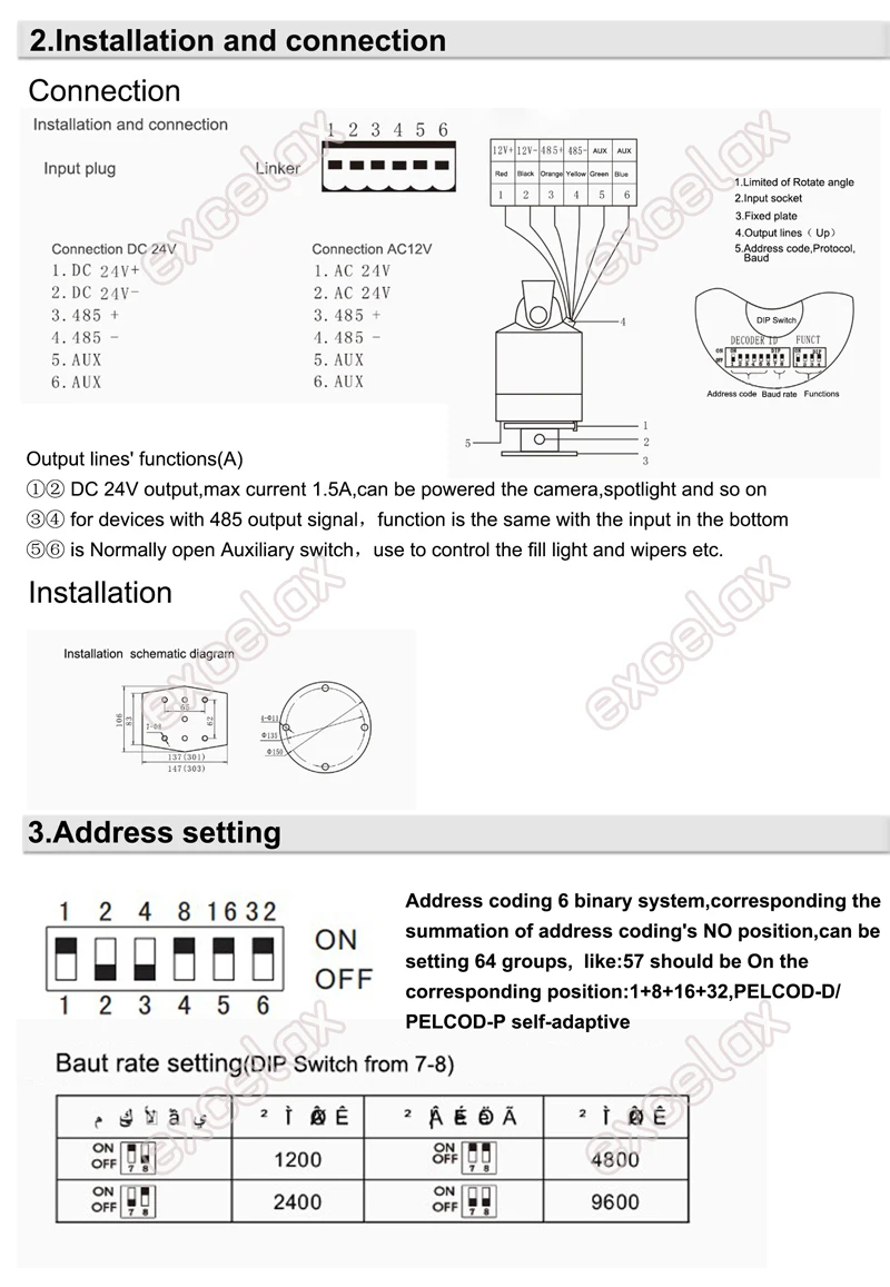 Вес нагрузки: по горизонтали 25 кг, по вертикали 12 кгПорт подключения функции: 1 - AC/DC24V, 2 - AC/DC24V, 3 - RS485 +, 4 - RS485-, 5 - AUX, 6 - AUX (см. Руководство пользователя)