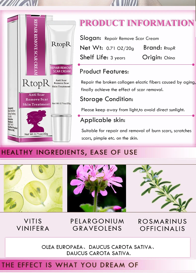 Он может ускорить регенерацию клеток, делая его эффективным в обработке шрамов, оставленных травмами и ожогами. Разнообразие растений фруктовое масло эссенция, богатая вариативностью питательных веществ, необходимых для кожи, может просачиваться через кожу. Он способен ускорить генерацию коллагена, чтобы отремонтировать сломанные коллагеновые эластичные волокна, вызванные старением, наконец, достичь эффекта удаления шрамов.