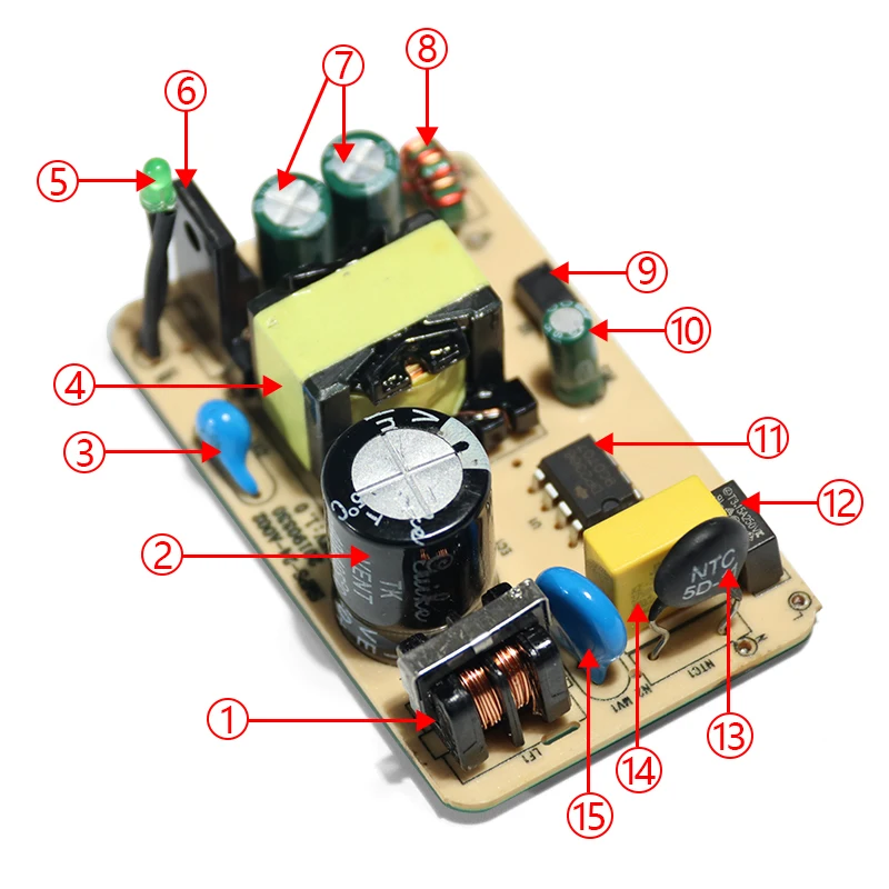 1. Индуктор общего режима: фильтр 2. Основной алюминиевый электролитический конденсатор: образует фильтрующую цепь 3. Конденсатор Y: образует схему фильтра 4. Основной трансформатор: преобразует напряжение 5. Светодиодный светильник индикатора: рабочее состояние оборудования дисплея 6. Выпрямитель Шоттки: высоковольтный выпрямитель переменного тока 7. Электролитический конденсатор: состоит из фильтра LC 8. Индуктивность: состоит из фильтра LC 9. Фотоэлектрический соединитель: обмен сигнала высокого и низкого напряжения 10. Электролитический конденсатор: состоит из цепи подключения сигнала 11. Чип: внутренний MOS трубчатый блок питания главный чип управления 12. Плавкий предохранитель: защищает электрическое оборудование в чехол от перегрузки и короткого замыкания. 13. Термистор: адаптер питания с защитой от температуры 14. Х Конденсатор: образует схему фильтра 15. Варистор: адаптер питания Защита от перенапряжения