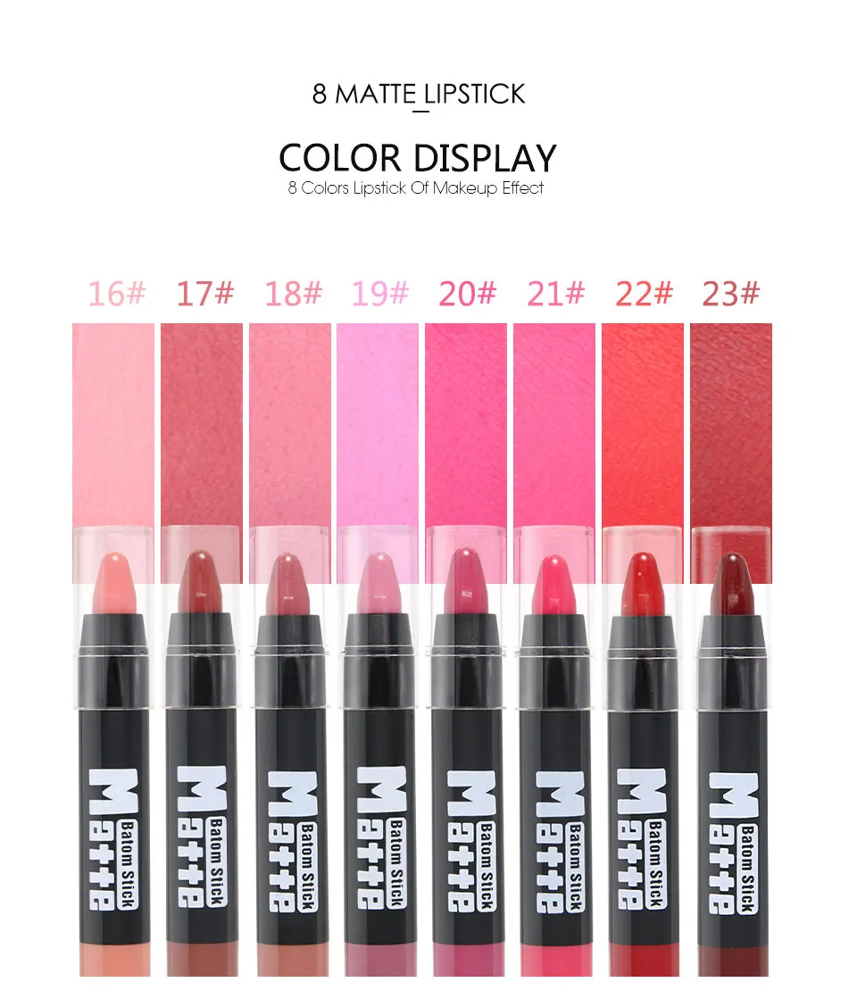 Характеристики: Эта матовая губная помада является своего рода карандашом для губ, она 2 в использовании помады и подводки для губ вместе, вы можете сначала сделать губную помаду, а затем сделать помаду,